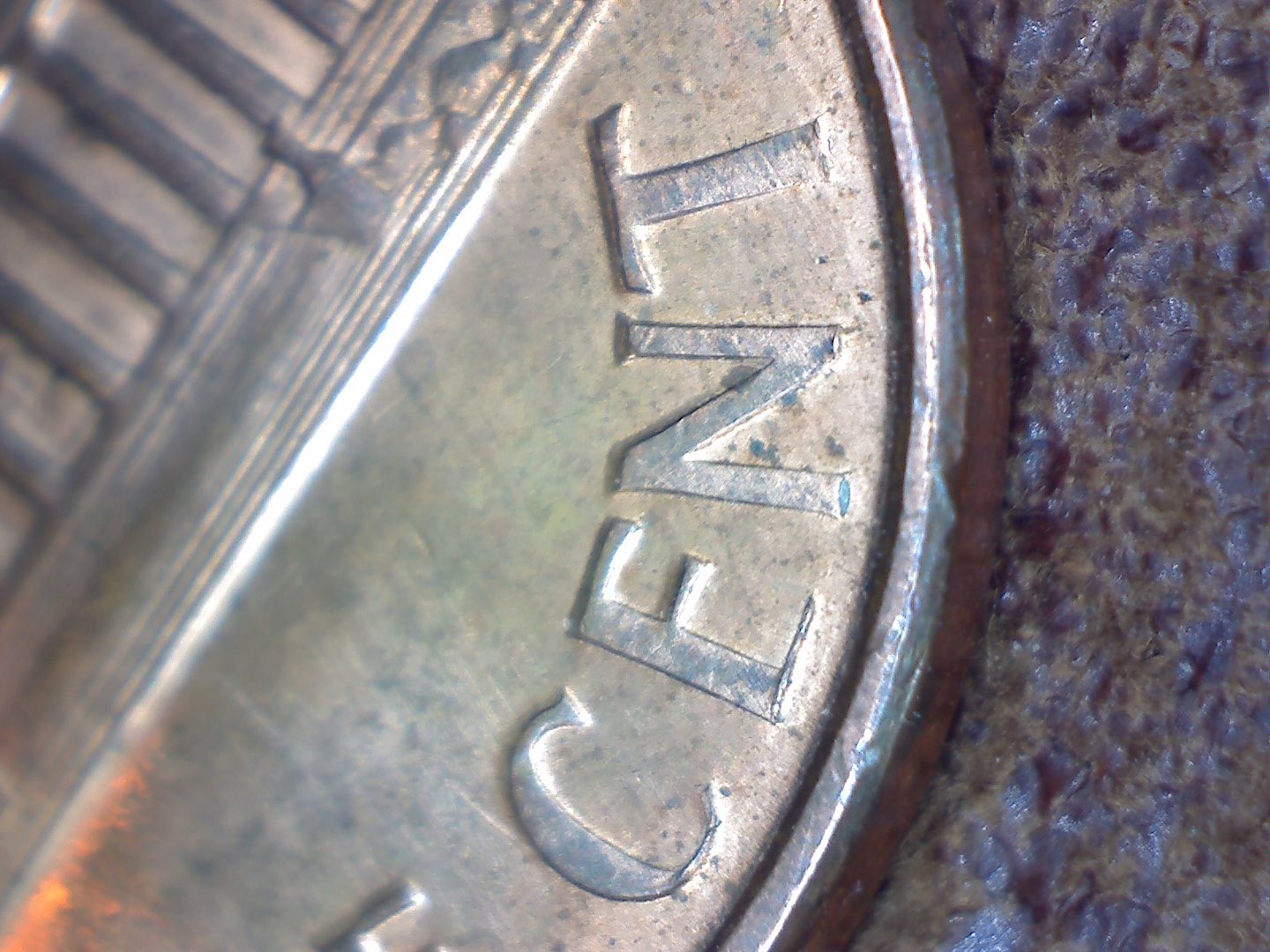 Pocket change- My question is: The front appears to be press through grease. Can't really see 'In god we trust", the rim is off, and the reverse of the coin looks great. Is this coin DOUBLED? See arrows. 'Cent' looks DOUBLED and the letter 'T' is not the correct shape. Best pics I can get(even got new glasses last week!) Thanks for help, if good going to send to Dr. Wiles-if not going to the coin star.