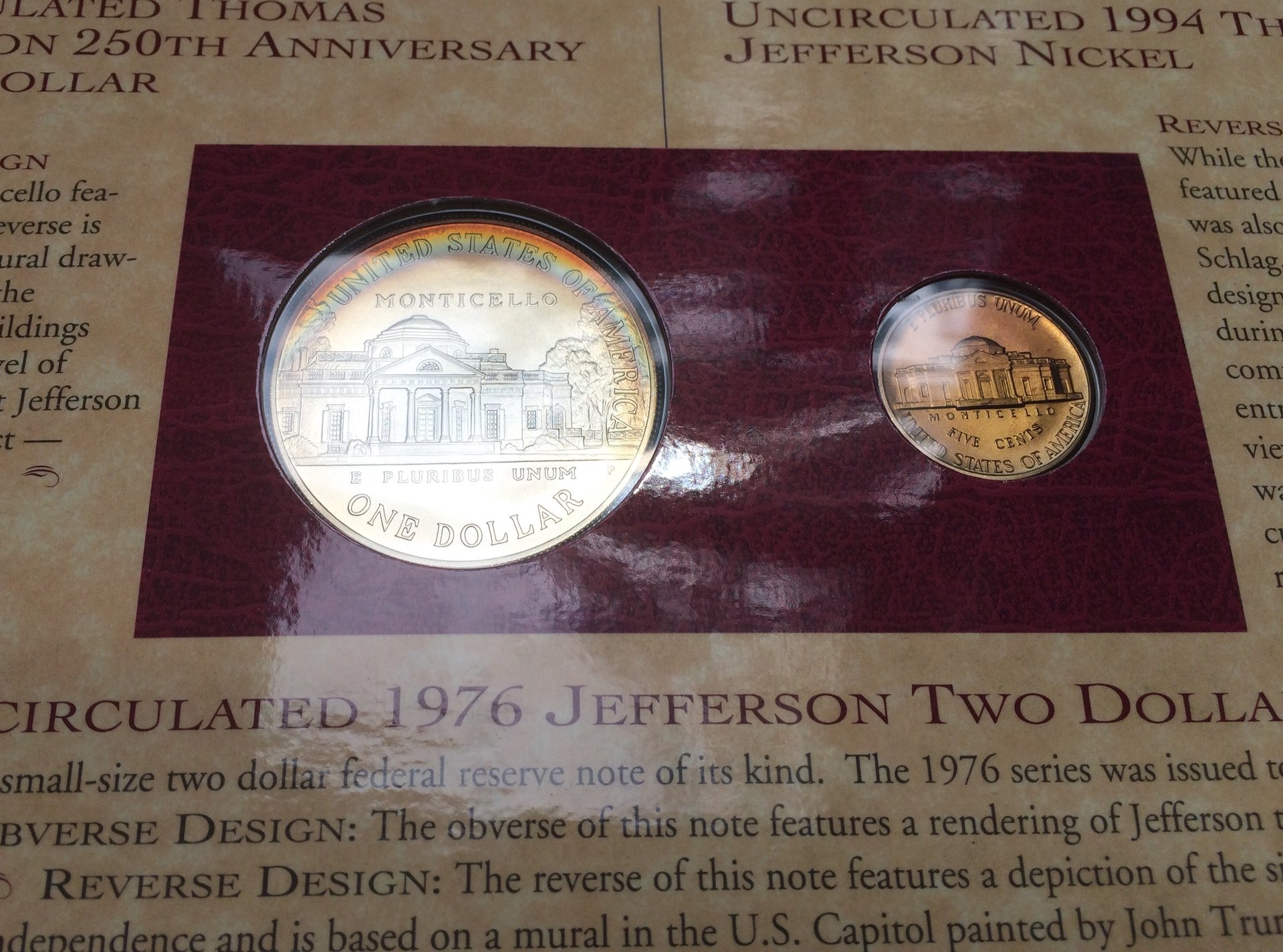 Picked up two of the 1994 sets (I'm calling it the 1994 set because the nickel is 1994, even though the dollar is 1993) from the LCS yesterday. Decided to "get around" to imaging the dollars so they could be listed on my website (and also pulling the nickel out and getting it set aside for a future bulk submission, hoping to get a 70 one of these days.) Well...I have seen some of these with some decent toning before. This is my first Jefferson dollar that I'm actually going to save...thought I'd share it with you. This time, I was smart enough to take a quick photo before taking it from the OGP...which will be important later.