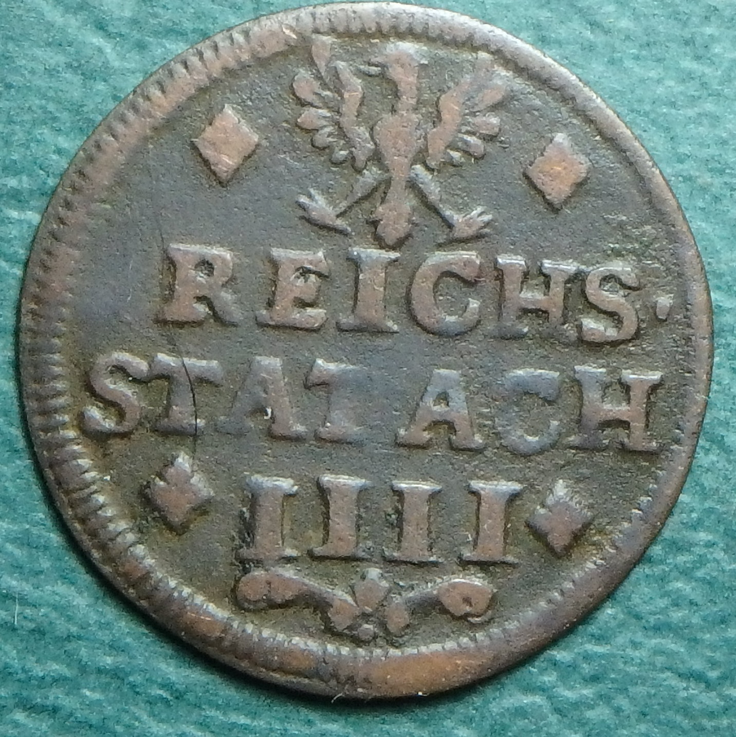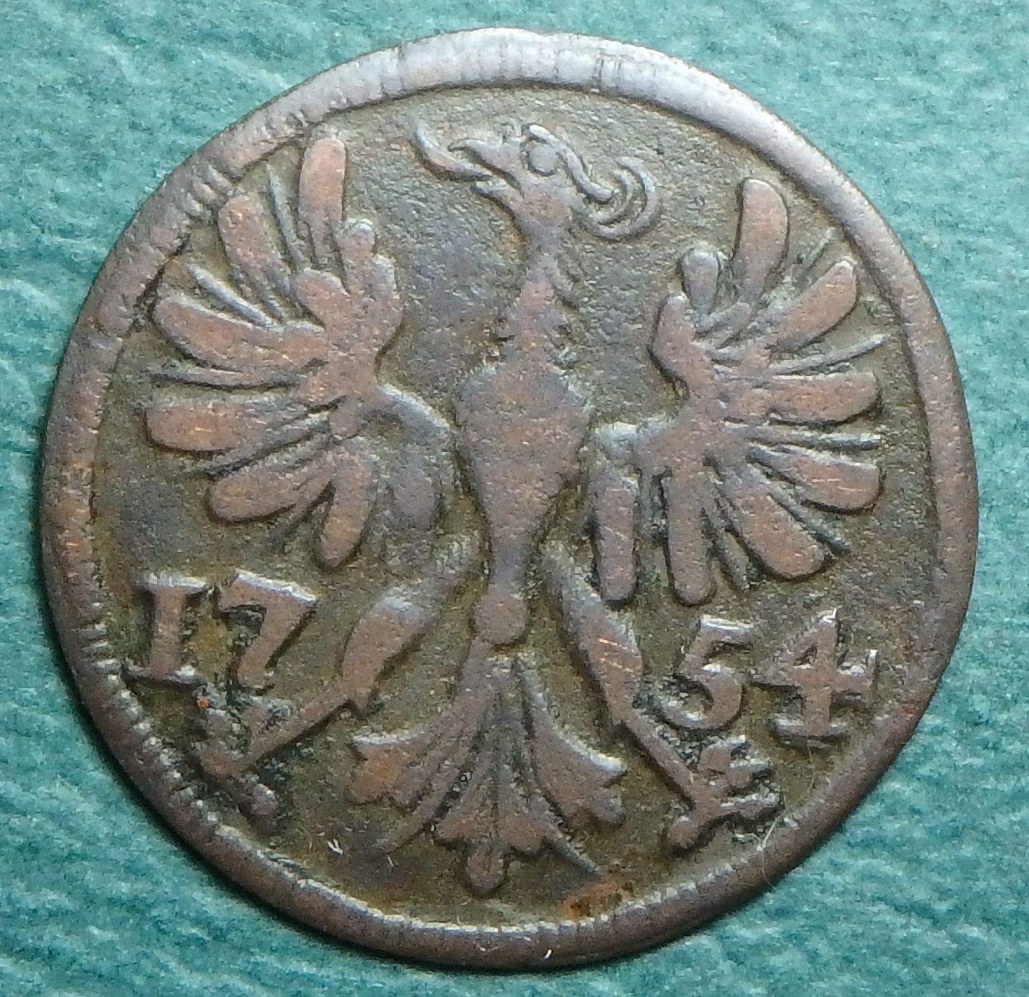 From Aachen, formerly a German State over near the Belgium border, 1754 IIII heller with a long tongue eagle. 1754 Aachen IIII h obv.JPG 1754 Aachen IIII h rev.JPG