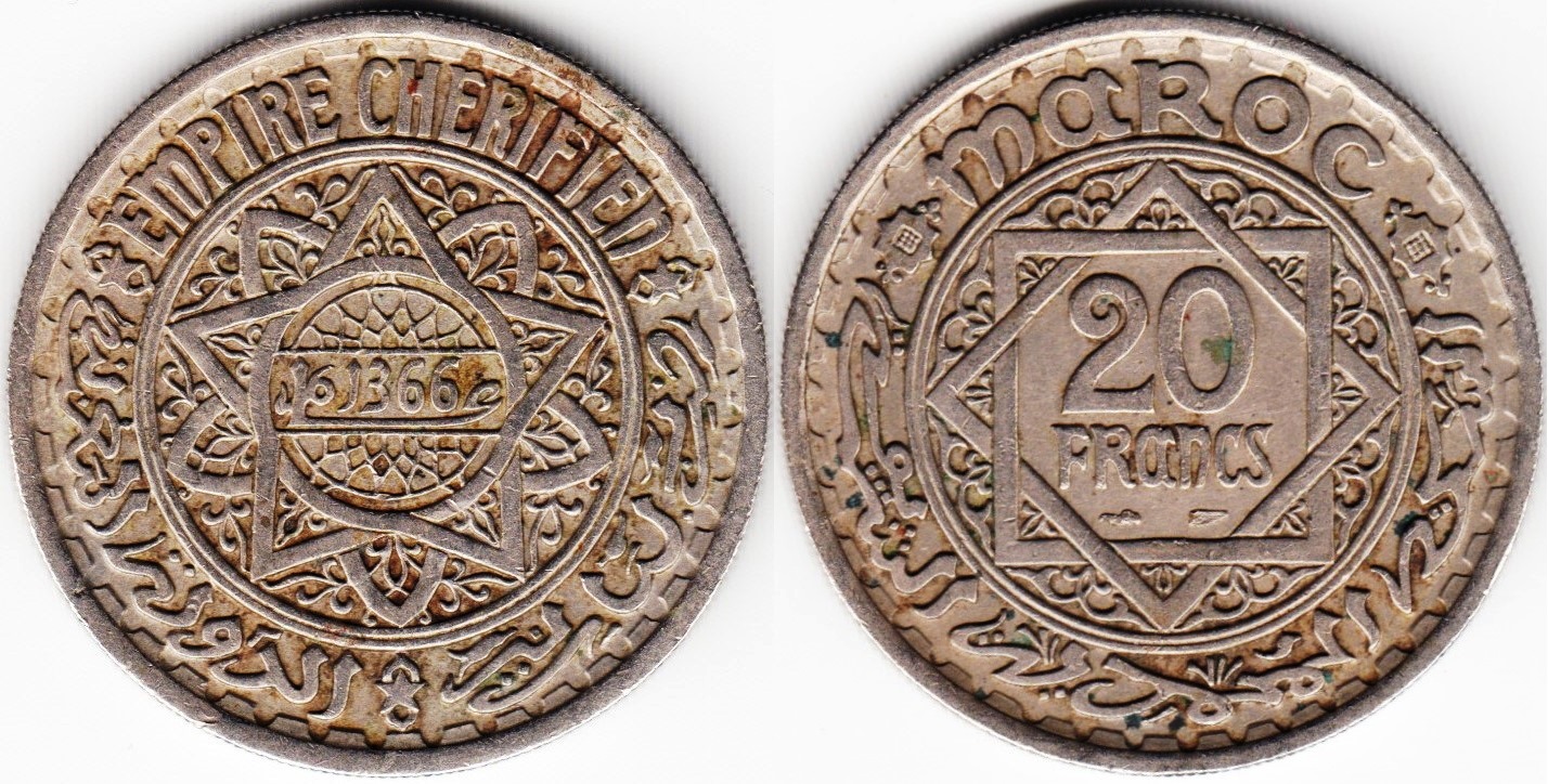 We'll just zing back across the Atlantic on over to Morocco! A 1947 20-francs (Y 45). So, did the glue hold well enough?