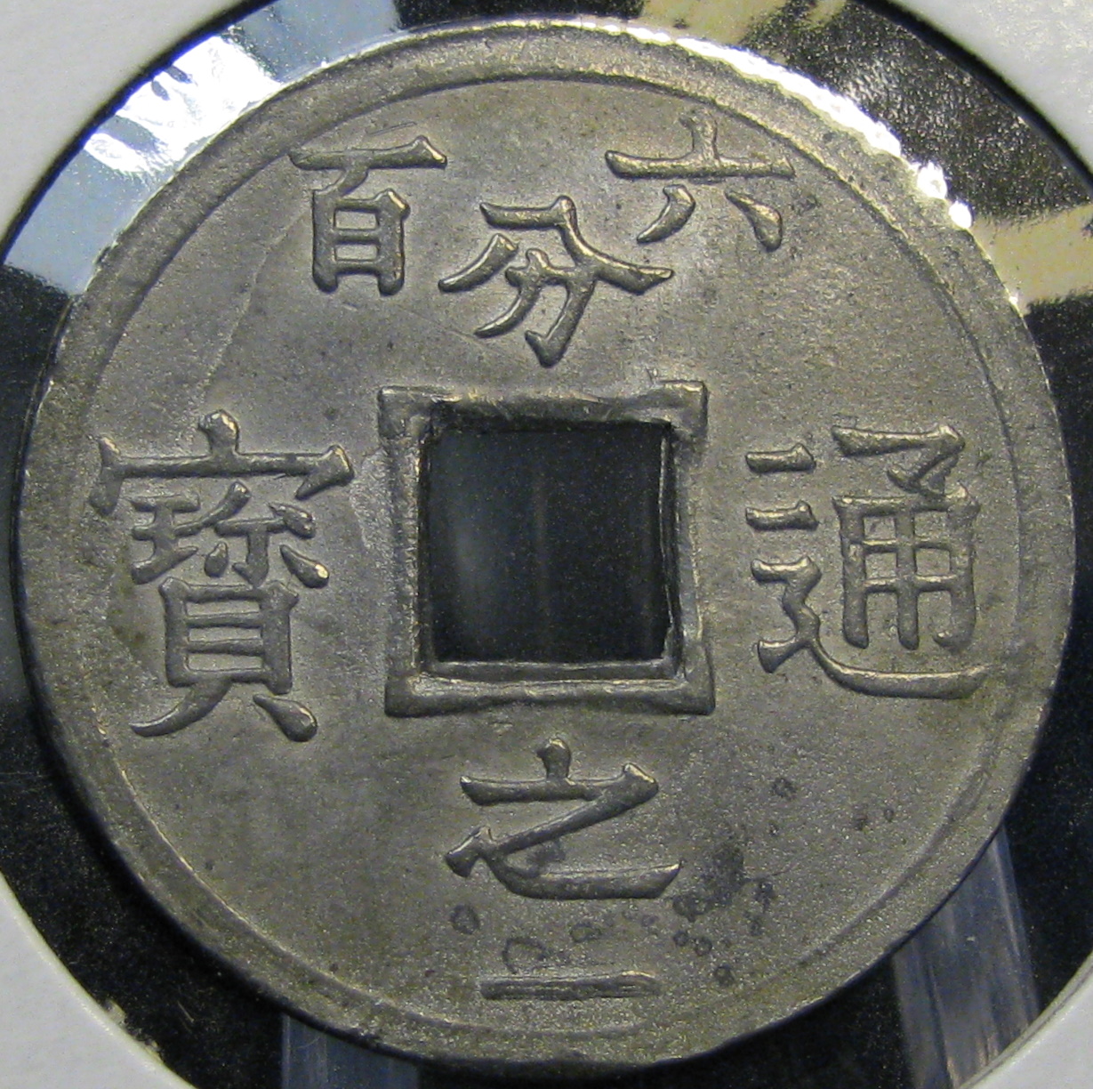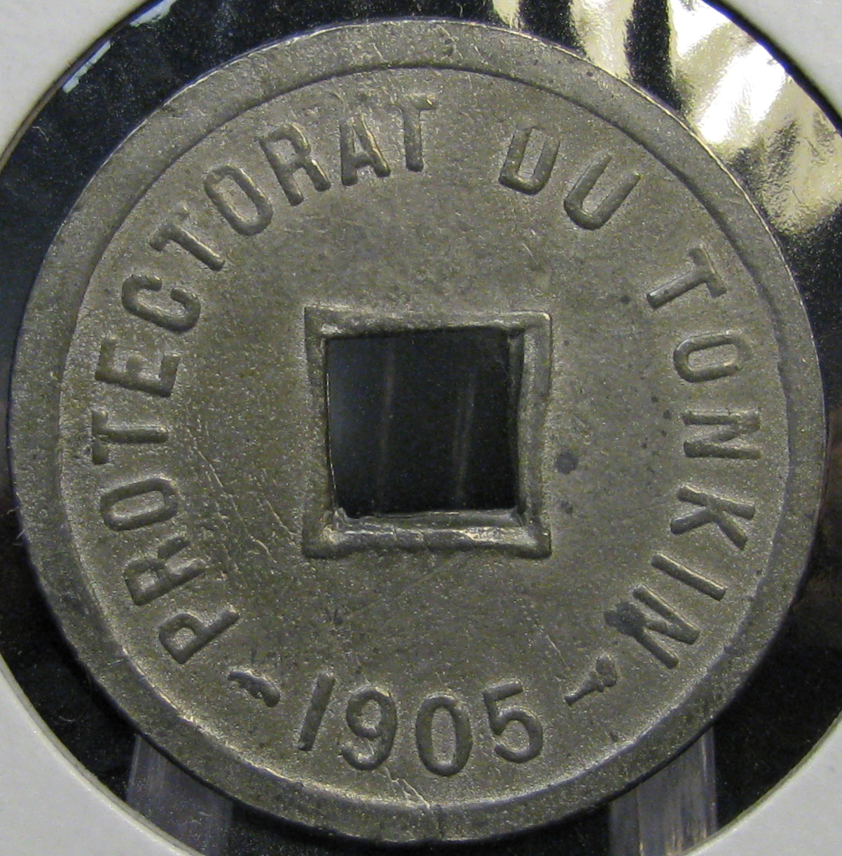 How about this - a contemporary counterfeit of a coin from the French protectorate of Tonkin (now, part of Vietnam). If contemporary counterfeits are allowed....