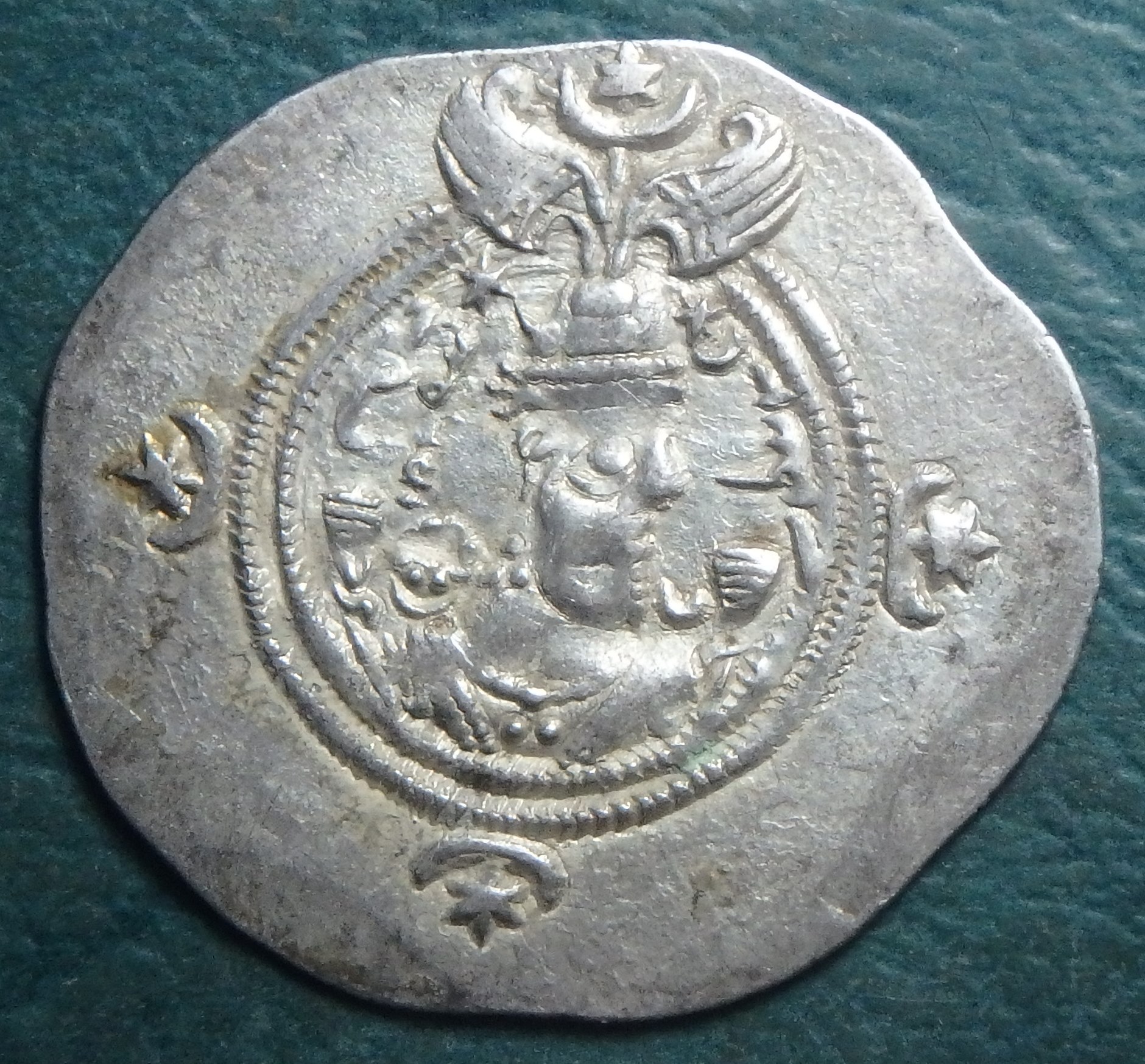 Yours is (I believe) an Imperial Sasanian coin, a regular, not an Indo-imitation, like this one is (albeit rather late, around the year 1000), of the middle-Indian dynasty of the Chalukyas: