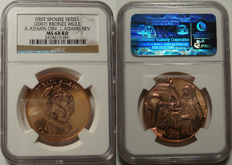On slabbed spouse medals: Personally, I will never buy another PCGS spouse medal sight unseen; NGC's have always been what I expected from the grade (so far!) I'll post some comparisons when I have the time. My Abby/Louisa mule is NGC 67.