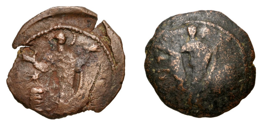 A better specimen, one where one can see the very non-Roman headgear of the two figures: AE16mm 1.23g trachy/stamenon Virgin Mary orans, standing between two columns topped by stars. The two despotes crowned, holding scepters, standing facing, three stars between them. unlisted in regular references; see Bendall, “The Diokitirion Square Trachion Reconsidered”, in Nομισματικα Ξρονικα 21, pp. 107-110.