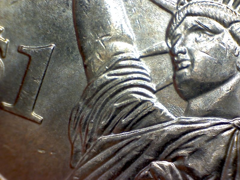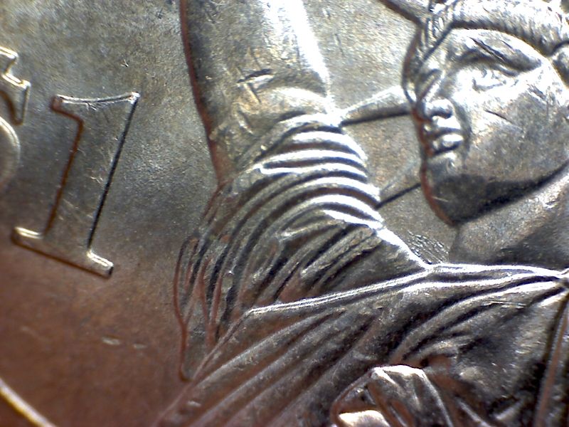 Has what appears to be an upside down P after unum and a lamentation or die break under Liberty's chin.
