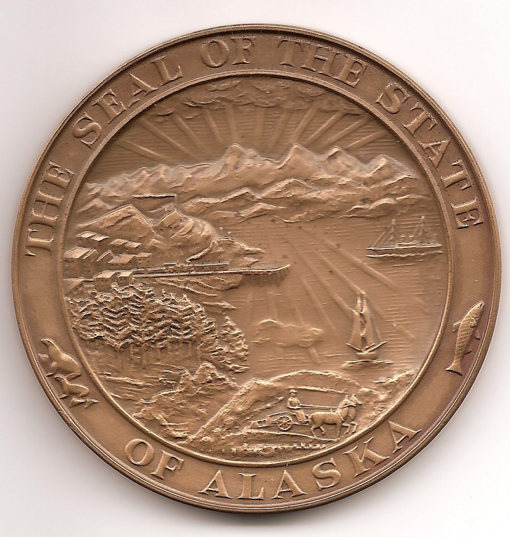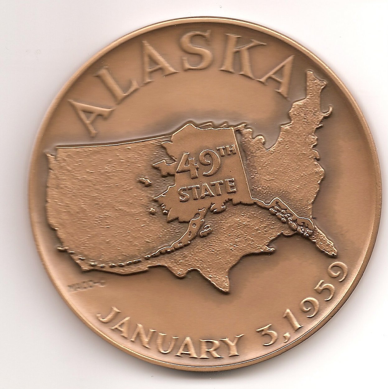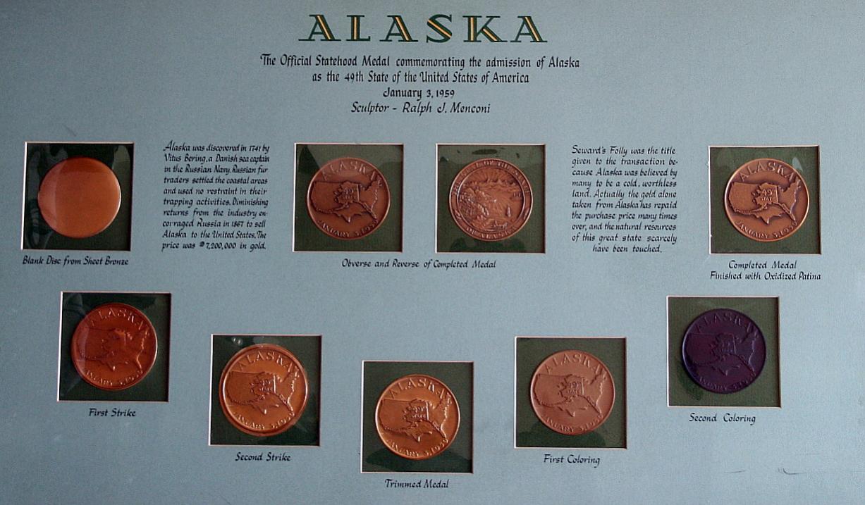 1) The set is called by several different names: Production Sample Set, Production Run Set, Process Set or Progression Set. 2) The set depicts the stages of producing the high relief 1959 Official Alaskan Statehood Medal that was minted by the Medallic Art Company. (an example http://preview.tinyurl.com/aa5noyq ) 3) The uncompleted medals are uniface. (an example http://preview.tinyurl.com/bruou54 ) 4) The set was possibly created by Medallic Art Company for its national distributor, The Coin and Currency Institute of NY and CA. This was to promote the medal and the method of production. 5) The set is housed in a plaque that is of high quality workmanship and made with archival materials. The plaque is sealed from the environment. 6) I know that this set is rare and I have only found a single reference that is similar to this set ( http://preview.tinyurl.com/bf8b9ol ). The set in the link are completed medals in different finishes and coloration and it by does not cover the 7 depicted stages of production as in the picture. 7) There exists a sister set of exact dimensions and quality for the 1959 Official Hawaii Statehood Medal ( http://preview.tinyurl.com/axje4um ) 8) The May 1960 issue of The Numismatist has an ad from The Coin Currency Institute of NY and CA which is promoting the Hawaii and Alaska Statehood medals simultanously. It may be fesible that both sets were used to promote the respective medals at the same location. Any information provided would be greatly appreciated.