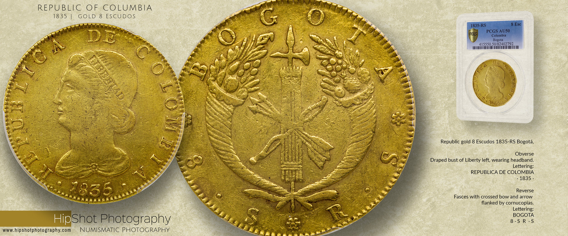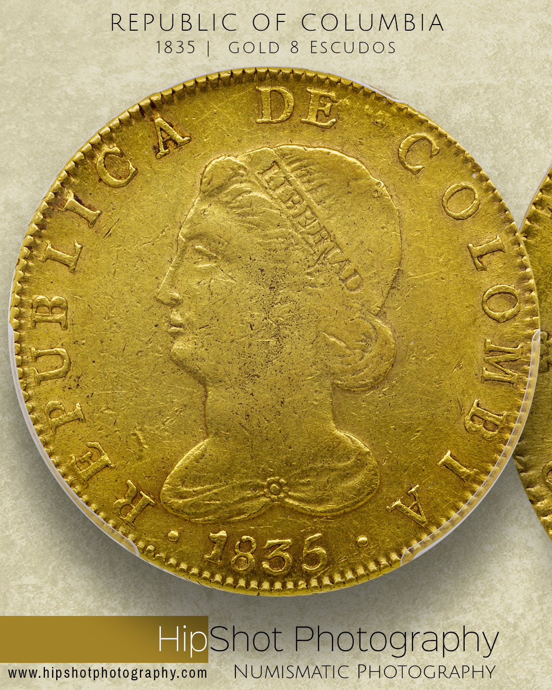 Speaking of certified coin photography, here's a shot of an 1835 gold Republic of Columbia 8 Escudos coin I took just the other day, using the same slab lighting technique I mentioned in my last post. You can see there are no pronounced highlights or shadows from the diffused overhead light, but still lots of texture and colour depth. The thing I don't like about shooting certified coins, other than shooting through a piece of plastic, is you always see the plastic edges of the holder around the coin. ...just out of curiosity, and for my own comparison, I found similar coins imaged by Heritage Auctions and NGC. and here by NGC. I don't think any of them are very good. Anyone else have images of these kinds of coins?
