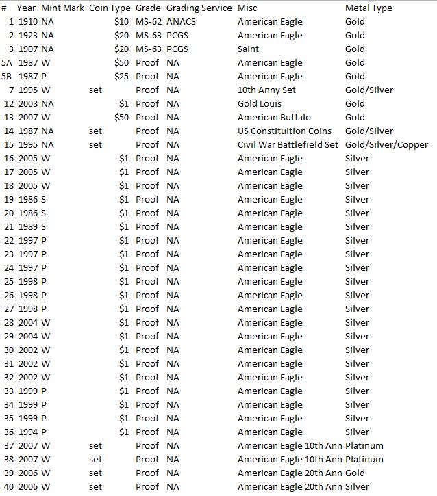 Heh... I wish I could. Yeah, that is what I am thinking. The pain comes when I started looking at how many Silver Eagles and Silver 1oz coins I have. It is just so overwhelming to even imagine listing each one on eBay, paying 10% fees, shipping, insurance,etc. Sorry, I sold to APMEX, they gave me spot price + 100 for a handful of my coins. I think I sold them 5 more common Gold eagles. We sold some of the big guns right away and it was frustrating losing $500-$600 bucks to eBay. I have about 6-7 safes full of coins. I grew an emotional attachment to them, but it was my Father's collection, not mine, so I decided to sell them. I will keep some smaller stuff just for kicks. I think the majority of the coin value is in 7-10 sets, but those 7-10 sets make up 5% of the total amount of coins. Time is definitely a premium for me, but I pretty much am looking at PCGS guides and taking 10%-15% off as a guide. The good thing is he bought the majority of these gold coins in the mid 90's. Are you recommending that I sell the high ticket items myself via eBay or will a shop give me decent value? For example, I know one set goes for around $6,000. Side story: We horded 25th Anny Silver Eagle sets from the mint in 2011 I believe. We made so much money so fast it was ridiculous. I think we still have 5-6 MS70 sets. We would get a box, send em right to PCGS for grading, and sell them instantly on eBay. Sometimes we didn't even bother to get them graded and just sold em brown box. Good times....