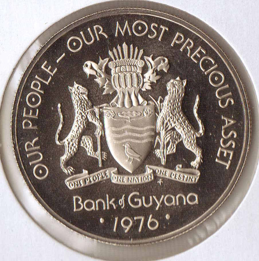 I got this today and wanted to share it. It's from Guyana, a 1976 1 dollar coin. You can't tell from the scan but it has a mirror finish. Shiny coins don't scan well unfortunately.