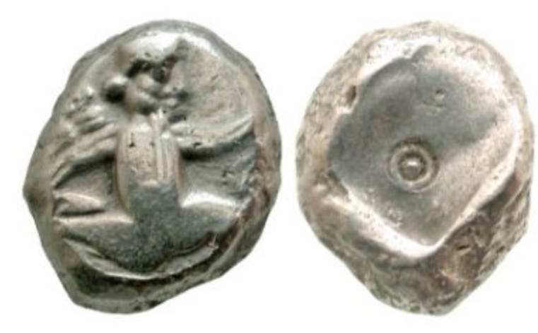 This little silver obol was issued in Cilicia, by Datames, a Persia/Achaemenid-appointed satrap who ruled in the early 4th century BC. His name is included in the coin's legend.