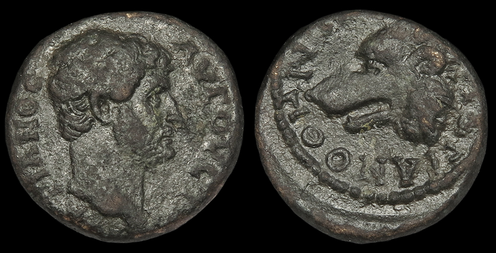 The she-bear type is particularly cool because it actually celebrates Hadrian's hunting exploits in Mysia, specifically in this case, his killing of a bear. The name of the issuing city means something like "Hadrian's hunts" and the expeditions may have been particularly memorable for him because he enjoyed them with Antinous.