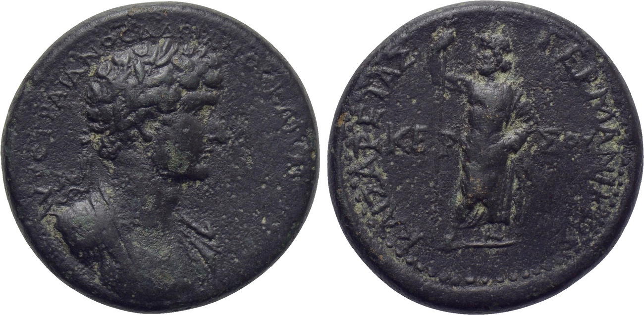 Reference. Emmett 1086.12; RPC 3, 5718; Köln 989; Dattari (Savio) 1709 & 7642; K&G 32.464; Issue L ΔWΔƐΚΑΤΟΥ = year 12 Obv. ΑΥΤ ΚΑΙ - ΤΡΑΙ ΑΔΡΙΑ СƐΒ laureate draped and cuirassed bust of Hadrian, r., seen from front Rev. L ΔWΔƐΚ Euthenia reclining on sphinx, l., holding ears of corn 12.36 gr 29 mm