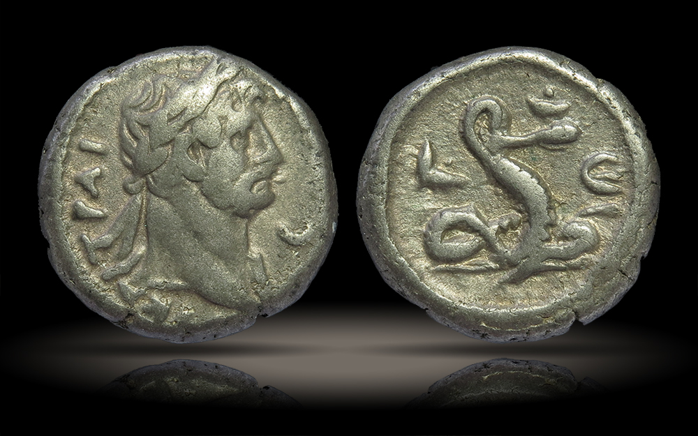 Agathodaemon is always welcome in my house EGYPT, Alexandria. Hadrian billon tetradrachm, 22.5 mm, 12.9 gm regnal year 5 (CE 120/1) Obv: laureate head right, crescent in right field Rev: Agathodaemon serpent standing erect right; L-E Ref: Dattari-Savio plate 71, 1532 (this coin); RPC 5270; Emmett 803.5 Picture of the D-S plate (the picture is of the page in the book, which is a picture of a rubbing of the coin)