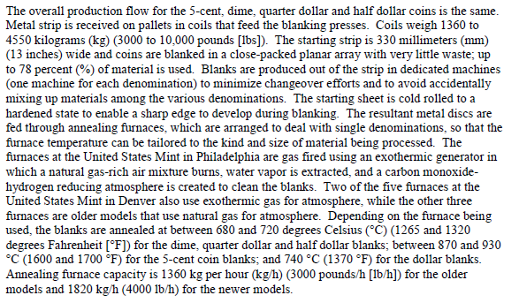 some excerpts from the alternative metals document ... · The Philadelphia and Denver facilities frequently have different production experiences with the same coin design. · Currently, all coin designs are modeled and digitized, or produced digitally. · Master dies are prepared on digitally controlled milling machines at the Philadelphia facility. · After heat treatment the master dies are used to impress an inverse of the design into another piece of heated die steel, the hub. · After additional heat treatment, the hub is pressed into another steel piece to produce a working die that will be used in a coining press. · Master dies are distributed to the Denver facility, which produces its own working hubs and dies. · Despite using the same masters, the crown heights of dies and design heights of relief produced at the two facilities differ, · 138 which has a measureable effect on coin fill. Further research into the reasons for this difference and its impact on die life, coin quality and production costs is warranted. · Consistently high one-cent coin die failure rates significantly affect overall production costs. · Average die life in 2009 reached a low of approximately 300k strikes at both the Philadelphia and Denver facilities. · Since one press produces roughly 300k coins in one 8-hour shift, this failure rate reduced production efficiencies and costs from historical trends. · Note that one-cent coin die life from 2000 to 2008 averaged 1 million (M) hits, but that has fallen to under 500k from 2009 through 2011. · In the Philadelphia facility there are seven presses in one production cell for one-cent coins, and a single operator manages six or more presses at one time. · Desired production rates rely on any six of the presses being in operation at any given time. Therefore, if one press is down for a die change or for some other reason, these production rates are not impacted. At the Denver facility, · however, the production rates rely on all presses to be operational at all times; therefore, an increase in the frequency of die changes can be more disruptive. An average die life of 600k or more strikes (1M strikes or more for one-cent dies) would be beneficial for both sites.