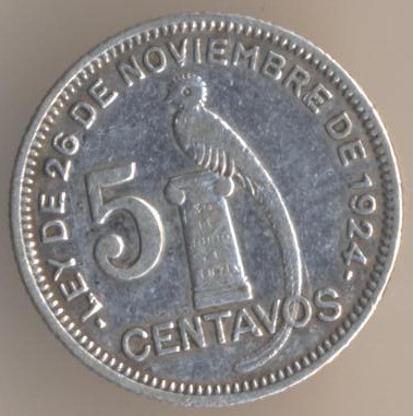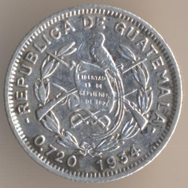 Guatemala. 5 centavos 1934, silver .720, weight - 1,66 g., size - 16 mm, mintage - 1200000 pcs.
