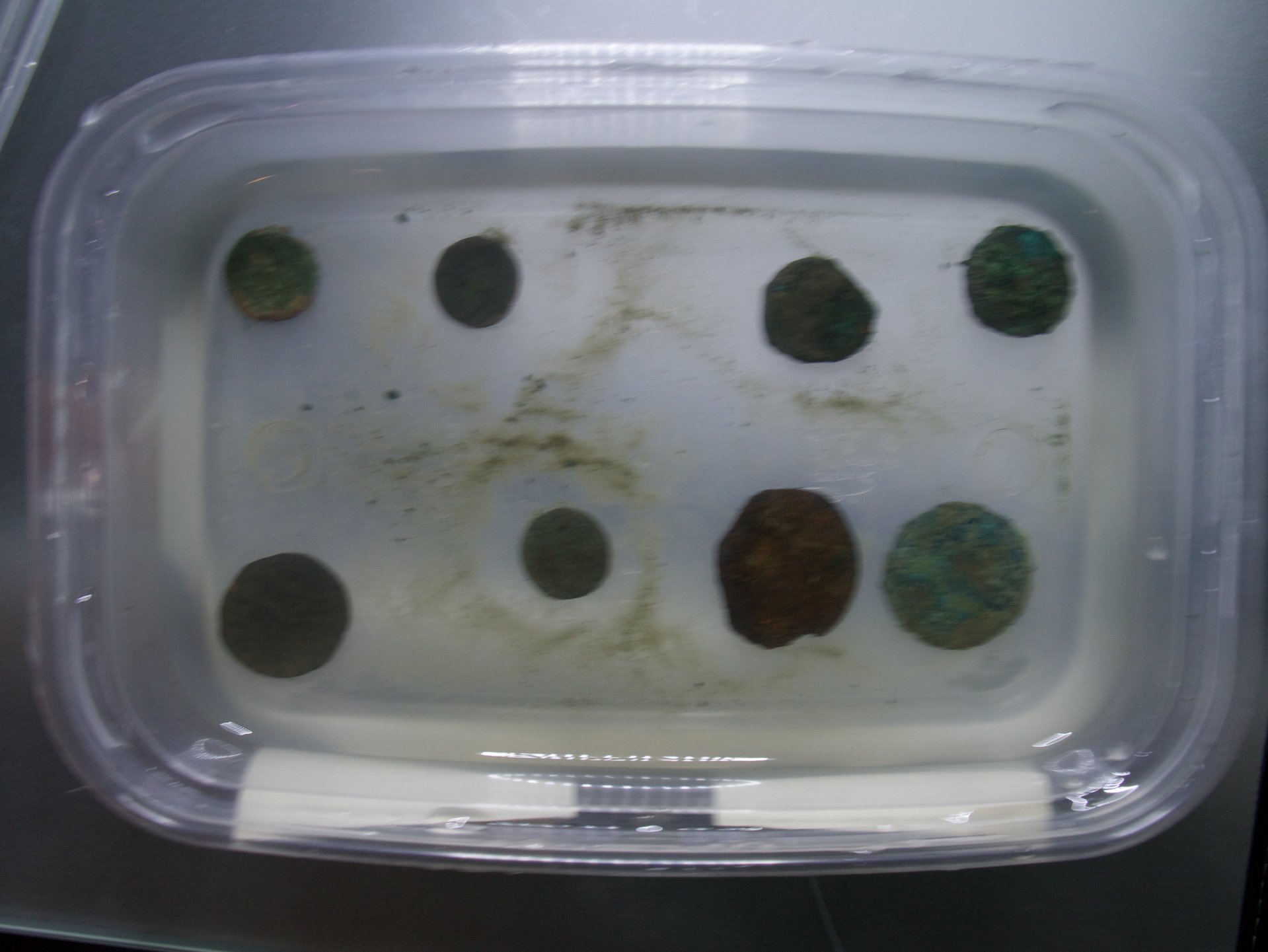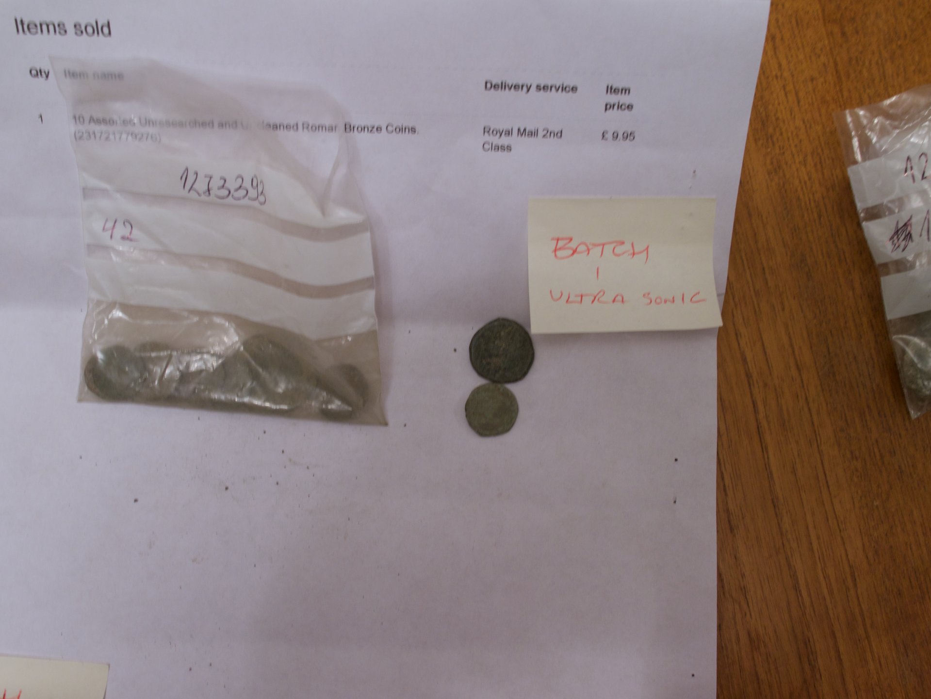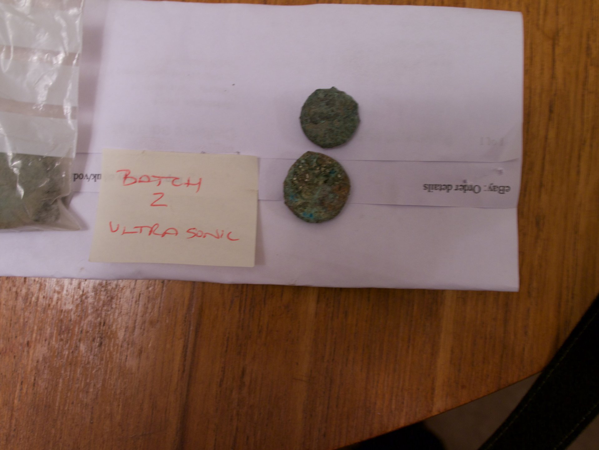Day 1. Coins arrive. Yay! Decided to get a 'heavily encrusted batch of 12 and a uncleaned batch from the same guy. Cost a bit under £20. The first 4 or each batch in water and phase1 moving. Total 8 coins. The second batch of 4 of each batch in the Ultrasonic cleaner for a couple of minutes and in the water. The third batch will join them after the electrolsys thing arrives. The coins look pretty yuk dry but you can see more detail when wet. I have one that looks good - the rest look pretty much like rocks. Day 1 and despite either method used I cannot see much difference. Looking forward to next gadget arriving from eBay.