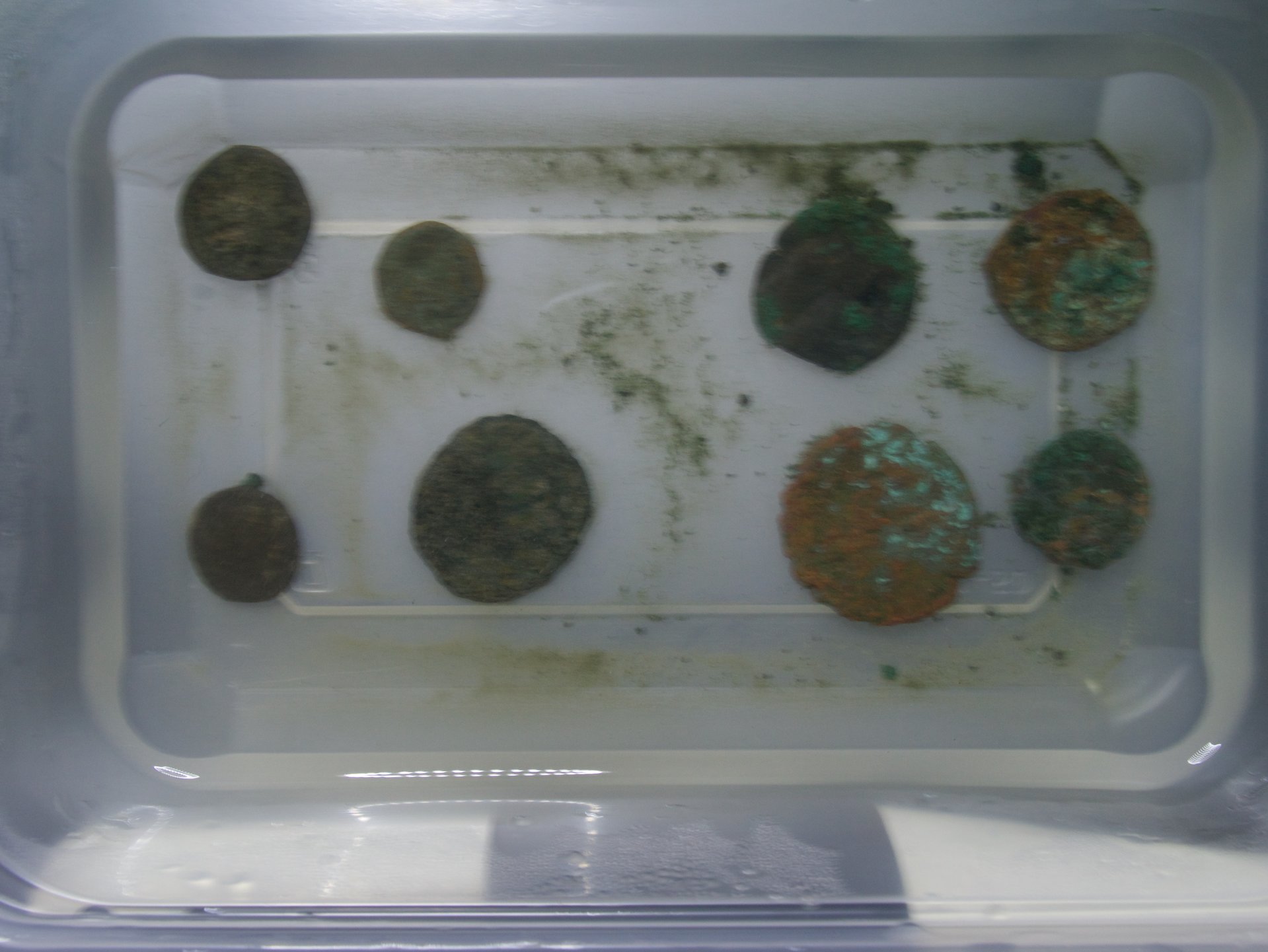 I am fast coming to the conclusion that the key thing when cleaning ancient coins is correctly picking the coins to work from. Don't buy a batch unseen. Don't misunderstand me, I am not throwing the towel in with the current batches but fast coming to the conclusion that they are mostly very low grade. This seems to be borne out by the seller I got mine from is selling very nice cleaned coins. There is a possibility that he randomly selects the coins he cleans, but realistically he is going to pick for the bunch and flog the rest. A progress update on day 4 shows a few very smooth metal lumps with few distinguishing marks and some show some promise of faint lines and designs underneath. The mud has all dissolved and even some of the more crusted coins are starting to 'melt the crud off. Without doubt there are some signs of bronze disease but most of the crud dissolves other patches. I have a feeling that the majority of these coins are so flat there is very little to key the crud to. The good news is that the crud dissolves off - the bad news it dissolves off leave little hope for the future. So a scrub with cotton buds and a water change completed.