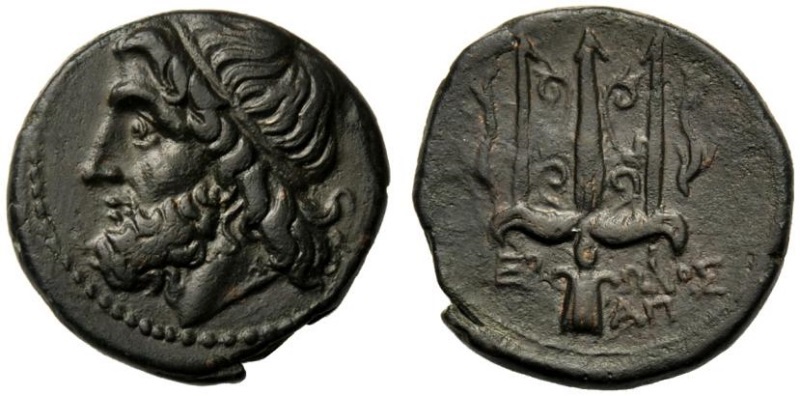 @rrdenarius , great coin, and REALLY cool history. It looks like YOURS, @red_spork , and mine are of a SIMILAR overstrike! Several months ago I attended a coin show in Raleigh, NC. The dealer said it was a Janus head. He had NO CLUE as there were none this small (it is 5.3g / 19mm)... I snatched it up for $30 thinking nothing to lose. 19mm, 5.3g I spoke with @ancientcoinguru and we noodled through it. Actually ACG NAILED it! I was going down rabbit holes chasing Italia coinage, and she was going after the Sicily issues. We concluded: (I later purchased low cost versions of the coins so that I could verify) "WOW, that may be it... little dolphin, Prow interference, but the trident struts would parallel the prow, so hazy, but not destroy the overstrike... Would the Hieron II be around 5g? 19mm (shows AE24 in attribute...) YES>>> A) Sicily, Syracuse, Hieron II, AE 19 mm., 5.72g, head of Poseidon left, rev. IEP-ÙNOÓ, trident flanked by dolphins, Ó[?] below (SNG Morcom 828 var.), dark green patina. Obv. Diademed head of Poseidon left. Rev. IEPΩNOΣ, Ornamented trident head flanked by two dolphins; below, N. B) Anonymous.AE-Sextans, 5.21 g. Sicily, 211-208 BC. Head of Mercury right wearing winged petasos; • • above. Rev. Prow of galley right; grain ear above, IC before, ROMA below. Crawford 69/6b; Sydenham 310d; BMCRR 280. Brown patina. EF. Surely one of the finest known specimen That would work... SOoooooo..... 1) Crawford 69/6 Sextans... ROMA below, Corn ear above 211-208 BCE; 2) overstruck: 3) Hieron II AE Trident 275-215 BCE; 4) Siege of Syracuse 214-212 5) 19mm / 5.3g would fit for both coins Timing perfect @red_spork and I concluded this was a fascinating time in Roman History... 2nd Punic War, Siege of Syracuse, overstrikes of coinage... it was a busy time!