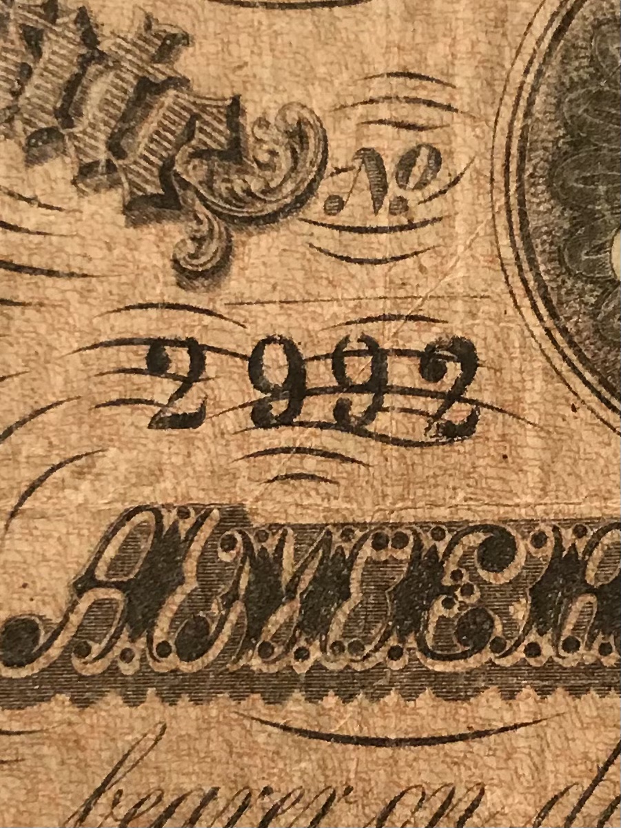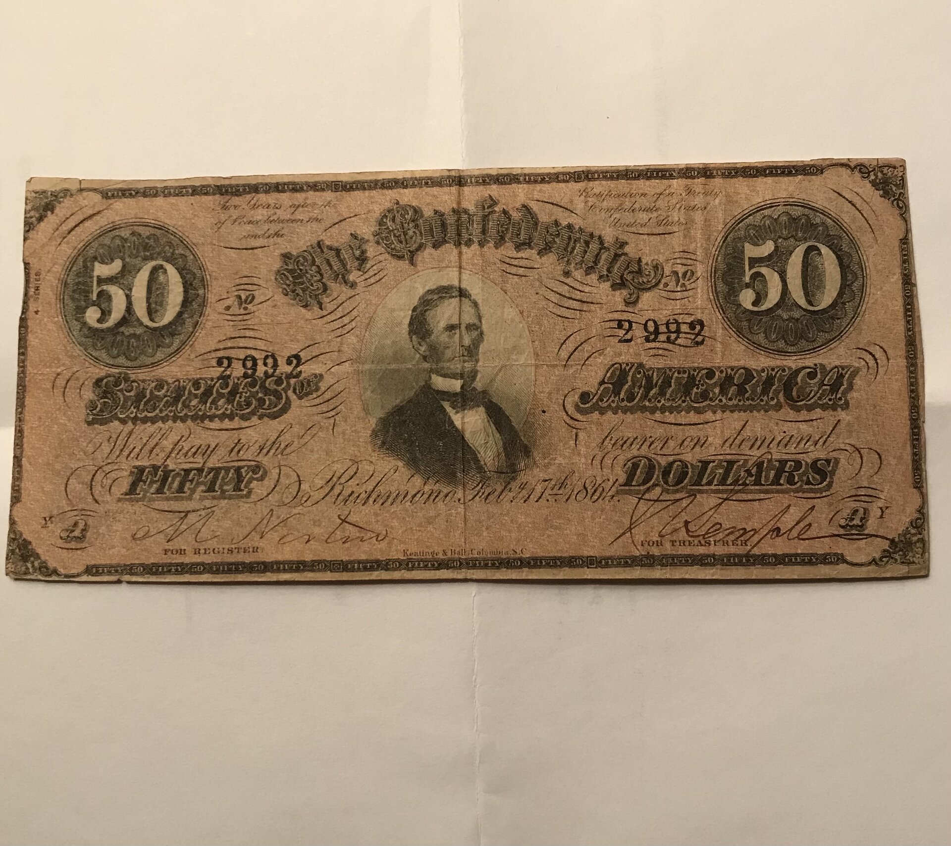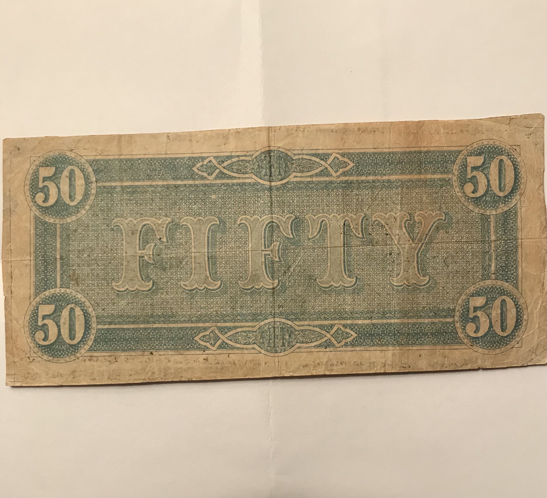 This is a genuine Confederate States of America Note from the Civil War. I just bought this one and it arrived yesterday. I already have this note but it was a very low asking price and I bought it because of the Serial Number. It’s a radar note, 2992 with plate position A. It has folds, the left side is trimmed very tight, there are a few very small nicks on the edges and it has 2 pin holes. Pin holes are acceptable but they do lower the value of the note. How much depends on the size of the hole and how many holes there are. This note would be graded in VF. It was issued on February 17th, 1864. It had a face value of $50.00. Just another little Christmas bonus to me, from me, as I’ve been very good this year. Lol
