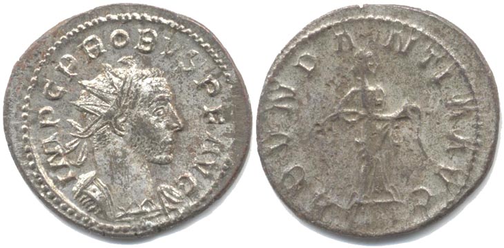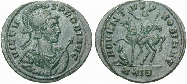 Fides - holding ensigns. The Fides type follows much the same pattern as that illustrated for the MARS VICTOR type above. The type is manufactured by Officina 3 (III) Emission 2/3 - IMP C M AVR PROBVS AVG Emission 4 - IMP C PROBVS P F AVG Emission 5 - Interesting busts illustrated above Emission 6 - Narrower busts, draped types become more prevalent, wider obverse legend variations Also in this emission is a rare peculiarity - FIDES VICTOR. Possibly an engraving mix up between FIDES MILITVM and MARS VICTOR.