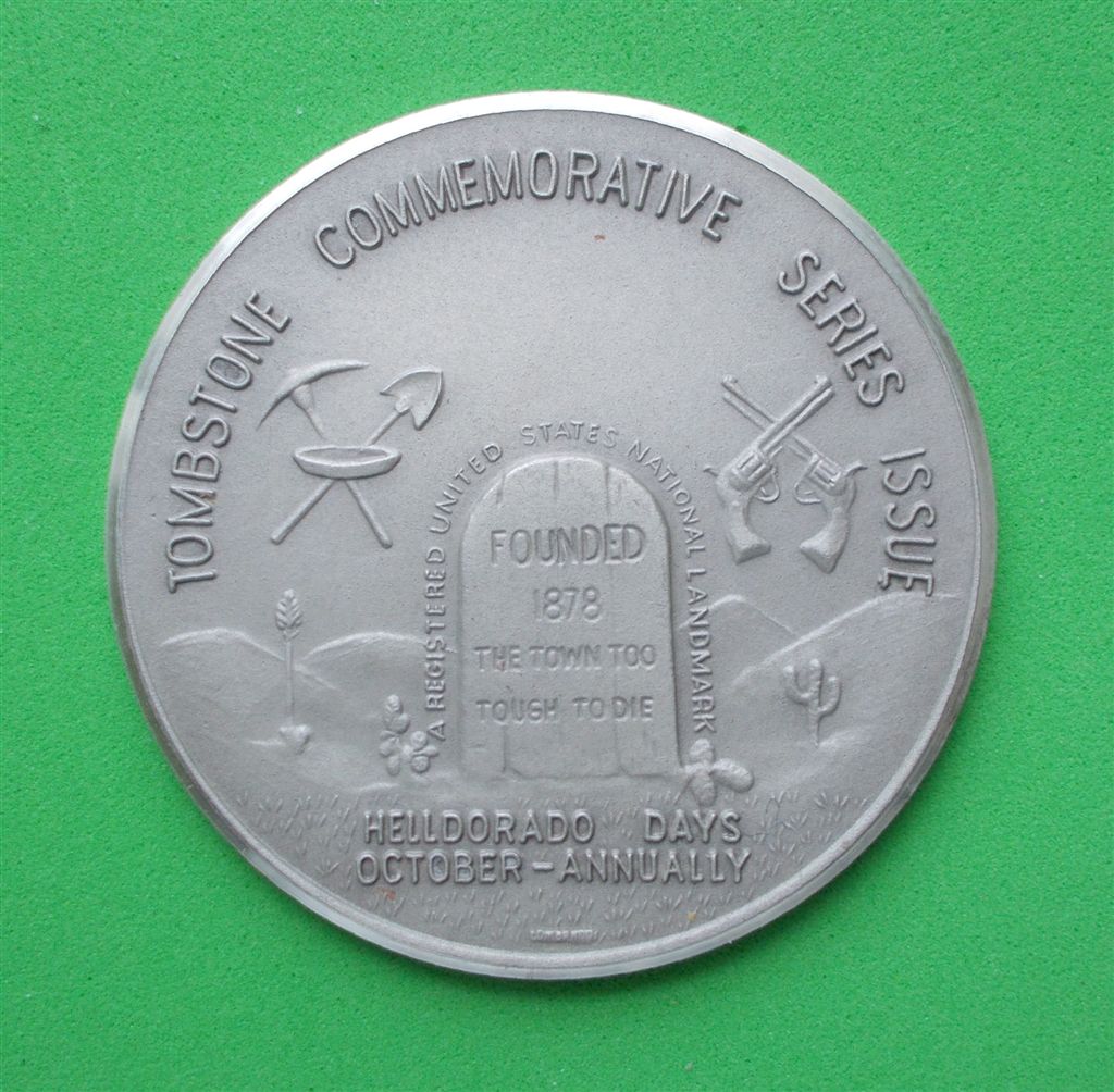 Struck in 1978 to commemorate Tombstone's centennial. Marked "999" and individually serialized on the edge (the highest number I've observed is in the lower 700 range). Weight is .71 of a troy ounce.