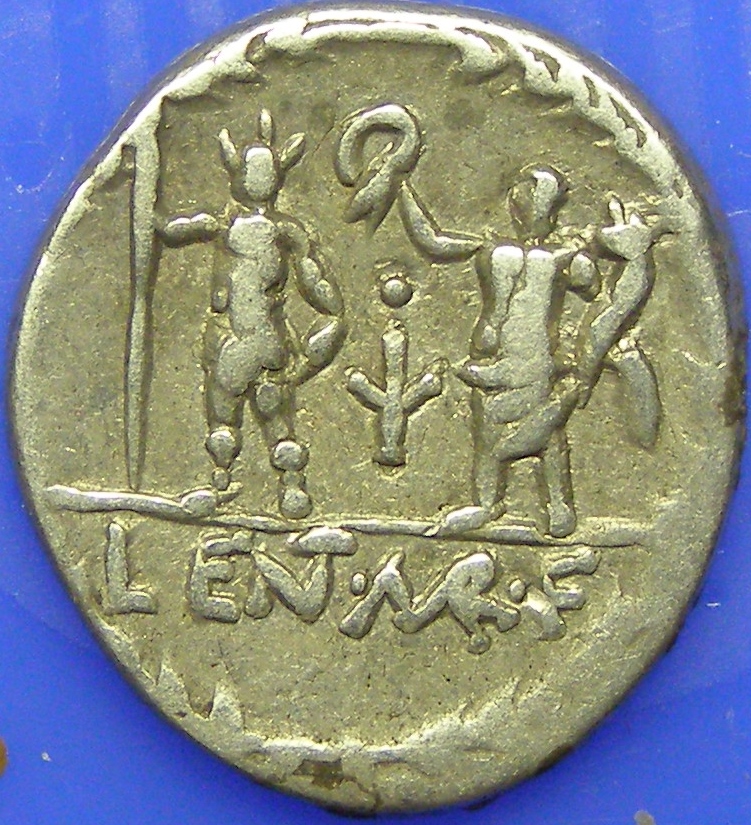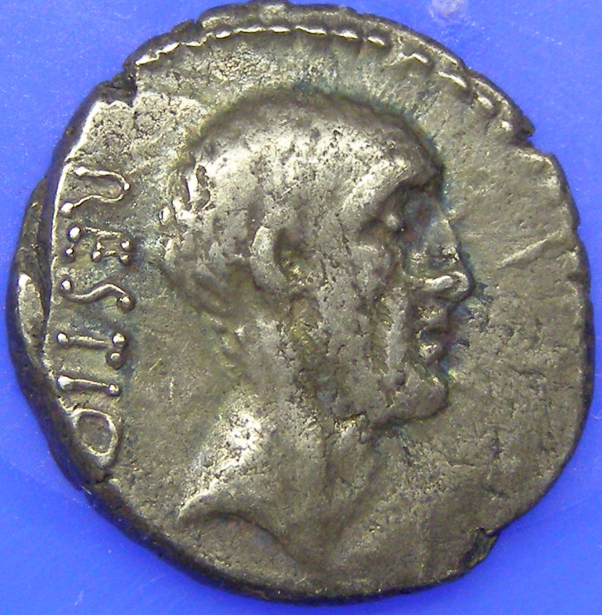 A Roman Republican denarius minted in Africa by Quintus Caecilius Metellus Pius Scipio and Marcus Eppius. Metellus Pius Scipio fled Rome in advance of Julius Caesar after Caesar crossed the Rubicon with his army. Grueber identifies Eppius as a moneyer for Pompey. Cr 461/1.