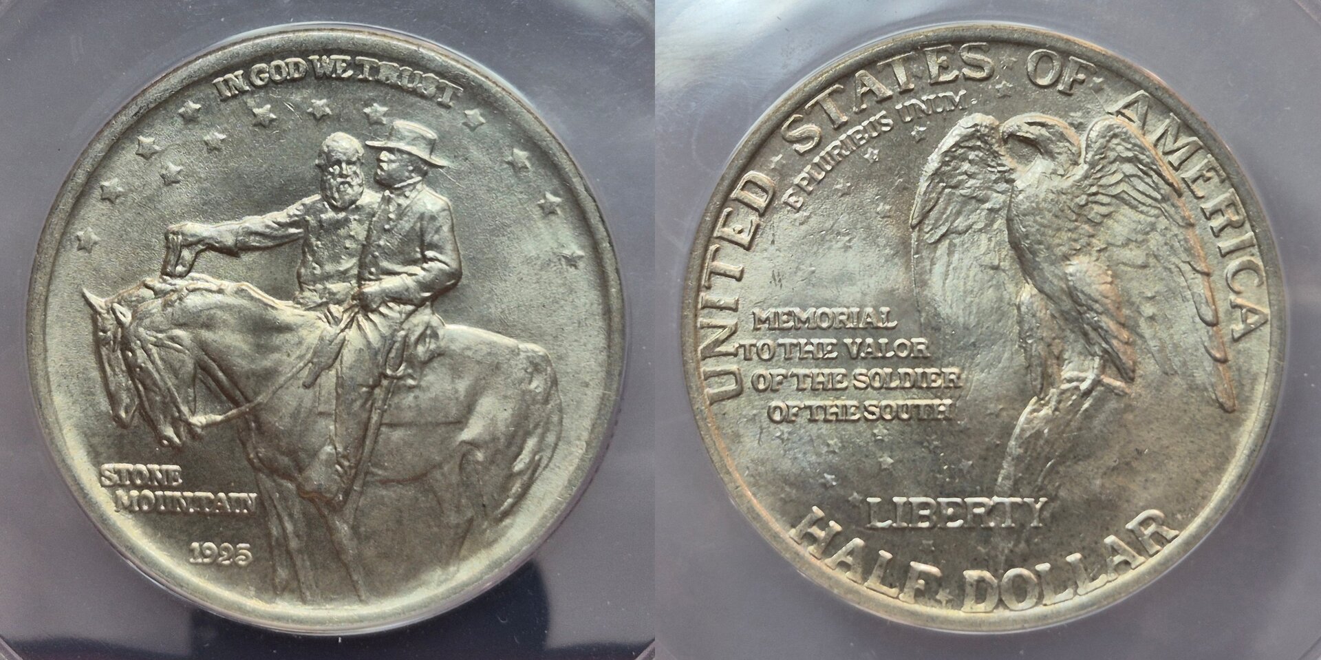 Actually it's a bit more complicated than that. Here's an article about that I wrote a few years ago. Every United States commemorative coin has a story to tell, but the history surrounding the 1925 Stone Mountain half dollar is one of the most interesting tales in U.S. numismatics. The legislation that authorized this coin rekindled a debate that had started before the end of the Civil War, and the project that it partially funded would remain incomplete for more than 30 years. The Daughters of the Confederacy Initiate the Project Mrs. Helen Plane was a charter member of the United Daughters of the Confederacy (UDC). For some years, she supported an idea to establish a Confederate monument at Stone Mountain, which is located 15 miles northeast of Atlanta, Georgia. Her plan called for a 70 foot high statue of Robert E. Lee that would be carved into the side of the mountain. In 1915, after she was elected president of the Atlanta chapter of the UDC, Mrs. Plane convinced other members of the group to ask sculptor Gutzon Borglum to do a feasibility study. Borglum reported to the ladies that a 70 foot statue on Stone Mountain “would look like a postage stamp on a barn.” The artist told them that an appropriate project would cost $3.5 million and would take ten years to complete. Borglum drew some sketches and presented his ideas at a UDC meeting. Although some UDC members were horrified at the cost of the project, others worked to make it a reality. In 1916 the owners of Stone Mountain granted a conditional deed to the UDC for the face of the mountain and ten acres of land around it. The site would become the property of the UDC if the organization completed a suitable monument within 12 years. The following year, the UDC chartered an independent organization, the Stone Mountain Confederate Monumental Association, to manage the project. The Project Faces Obstacles from the Beginning The Stone Mountain project was in trouble from the start. Before work could begin, the United States entered World War I. During the war all nonessential activities were curtailed, and the project was delayed until 1923. After the project began, Borglum found more challenges than he had imagined. No one had ever attempted a sculpture this large before, and even drawing an outline of the figures on the face of the mountain posed significant technical difficulties. Borglum’s original plan had called for three main statues: Generals Robert E. Lee and Thomas “Stonewall” Jackson and Confederate President, Jefferson Davis, all on horseback. Behind them and around the mountain, the plan called for depictions of other southern Civil War heroes, including the average foot soldier. Plans also called for a Memorial Hall to be carved into the base of mountain and an amphitheater at the base of the site that would be as large as the Roman Coliseum. Helen Plane, the honorary life president of the UDC, represented the dark side of the project. She sympathized with the KKK and concept of pushing for the monument to become a symbol for “the lost cause.” She suggested including a small group of Klansmen in the design “in their nightly uniform approaching from the distance.” Fortunately, her ideas were ignored although a resurgent KKK was in the mix to get the project started. The Project Begins By January 1924 Borglum’s men had carved Robert E. Lee’s head into the side of the mountain. On January 19 a group of dignitaries, including the governors from several southern states, held a luncheon on a banquet table set on top of Lee’s hat, which was indication of the size of the work. The UDC held many find raising events to finance the project. These events ranged from bake sales to gala balls at which participants contributed money and made pledges. In the mean time members of the UDC contacted President Calvin Coolidge to solicit his support for a commemorative half dollar that would be sold to raise funds for the project. Coolidge embraced the project, and Congress approved the legislation although not without difficulty. Feelings still ran high about the Civil War. The final legislation stated that the half dollar would honor the contributions of southern soldiers for their service during the Spanish – American and First World Wars, BUT NOT the Civil War. In addition the half dollar would also honor the memory of President Warren G. Harding who had recently died. Gutzon Borglum designed the coin although he had considerable difficulty getting Fine Arts Commission to approve of his work. Only Robert E. Lee and “Stonewall” Jackson appeared on the coin because Jefferson Davis was still a pariah to many in the North. The authorized mintage was 5 million pieces, which was a very high number for a commemorative coin. Ultimately the mint struck 2.3 million pieces, but 1 million of those pieces were returned and melted leaving a still healthy net mintage of 1.3 million coins. Borglum Departs In the mean time Borglum was having problems with the Stone Mountain Confederate Monumental Association. The association was not paying him in a timely manner and there were complaints that he was not supervising the project properly. Borglum had a thin skin and was more than willing to talk to newspaper reporters to make his complaints public. He charged that the association head, Hollis Randolph, was misusing and misappropriating funds. This very public argument became heated, and Borglum resigned. The artist smashed his models and left Georgia with the police hot on his trail. The Project Comes to a Feeble Finish The association hired Augustus Lukeman to continue the project. Lukeman is best known to coin collectors has the artist who designed the Boone commemorative half dollar. Lukeman restarted the project as he blasted the face of Robert E. Lee off the mountain and began his own interpretation of the work. Lukeman’s work in the mountain did not go well. One observer stated that Lukeman’s Robert E. Lee did not l