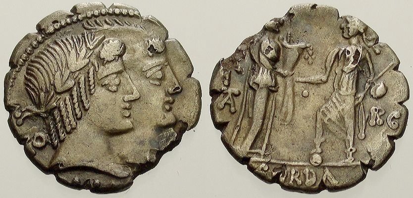 Roman Republic. Fufia 1, c. 70 BC Fouree Denarius. Rome Mint. 17.28 mm, 2.03g. Jugate heads of Honos and Virtus ----Roma and Italy hand in hand. Syd 797