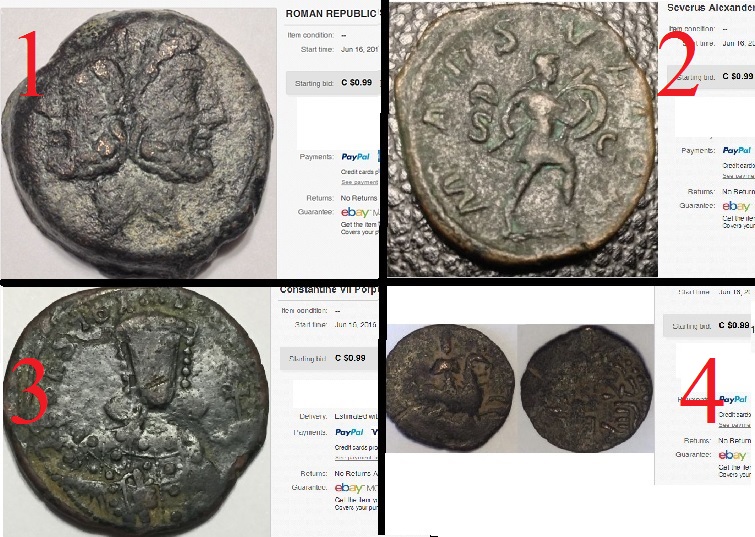 I listed 4 Ebay Auctions Today, 1 http://www.ebay.com/itm/222153120872 A Roman Republican AS 2 http://www.ebay.com/itm/222153474425 A Severus Alexander Sestertius 3 http://www.ebay.com/itm/222153483636 A Constantine VII Follis 4 http://www.ebay.ca/itm/222153478100 A Sulayman II Fals