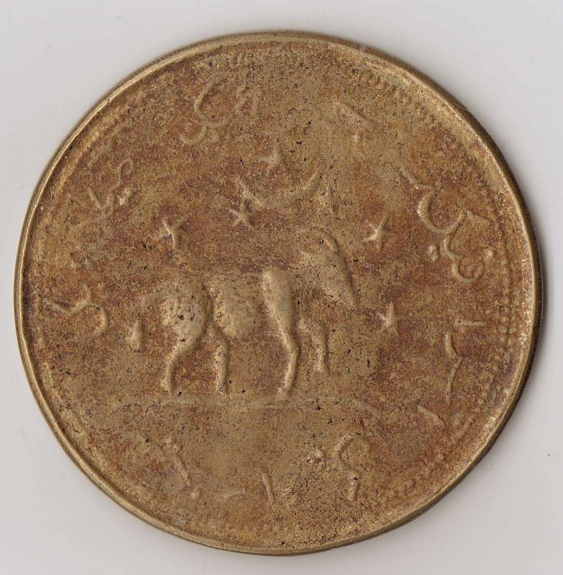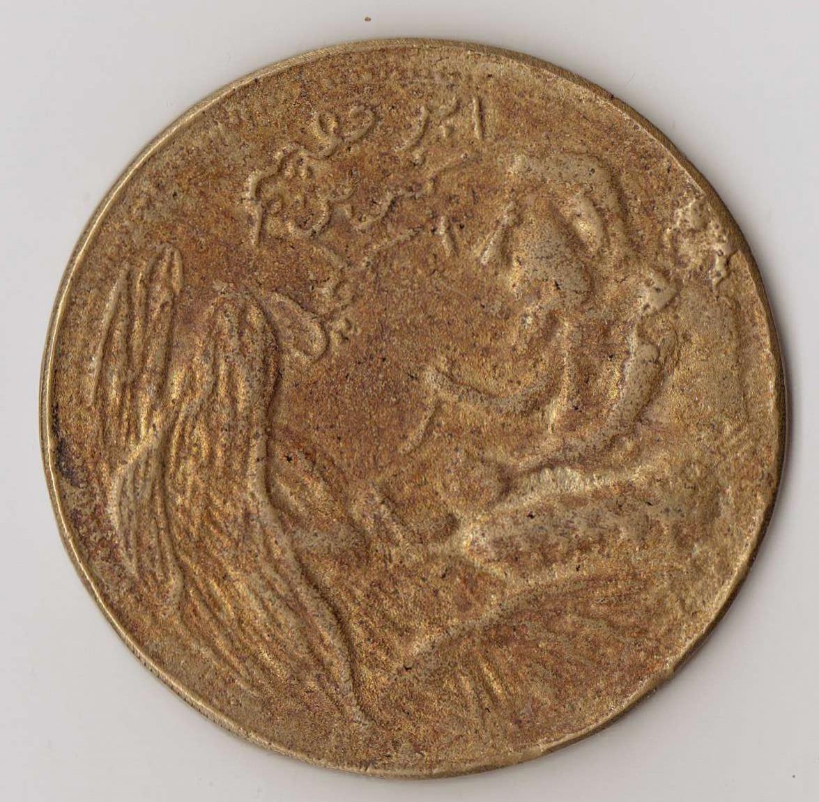 I'm looking for some idea of what this is. It's very large, bigger than an American Eisenhower dollar, but it's fairly light and thin. I think it's bronze or some other base metal. To me it looks like a reproduction of an old coin that is intended to look old. The writing reminds me of a Middle Eastern language. Does anyone recognize it or have an educated guess?