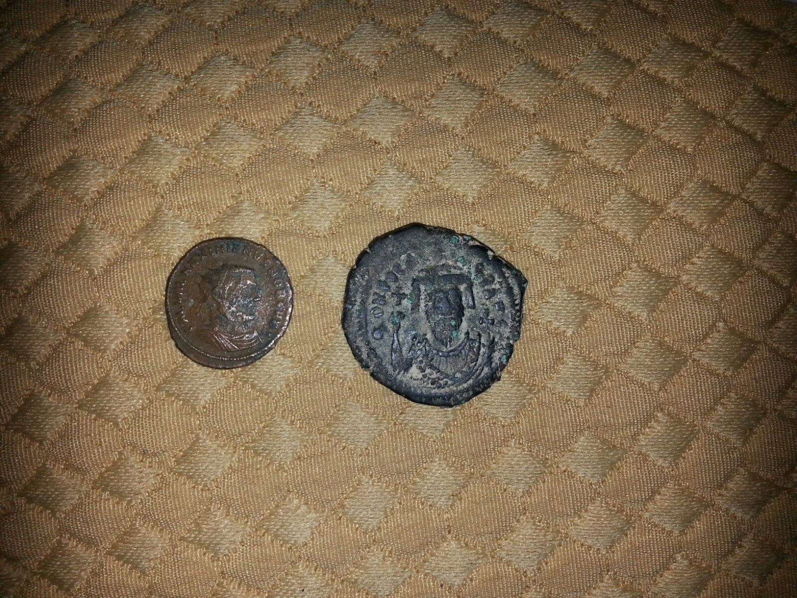 looks like a galerius from antioch left (roman coin) and a phocas follis of cyzicus on the right (byzantine)...phocas probably has bronze disease ...greens spots! scrape with a toothpick/fingernial and make sure none of that green stuff comes off as a powdery like substance.