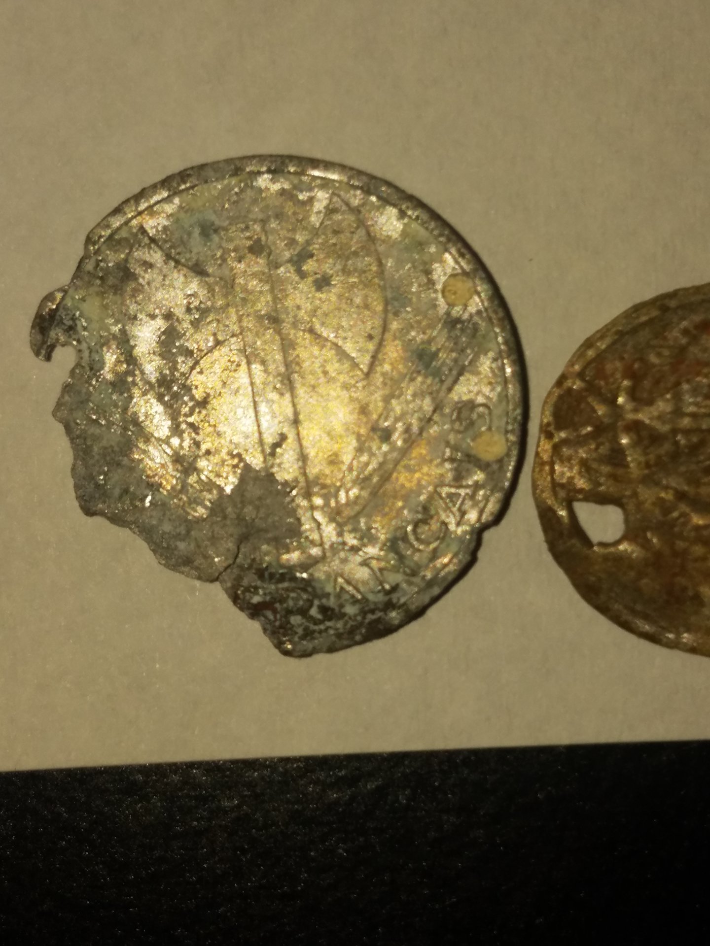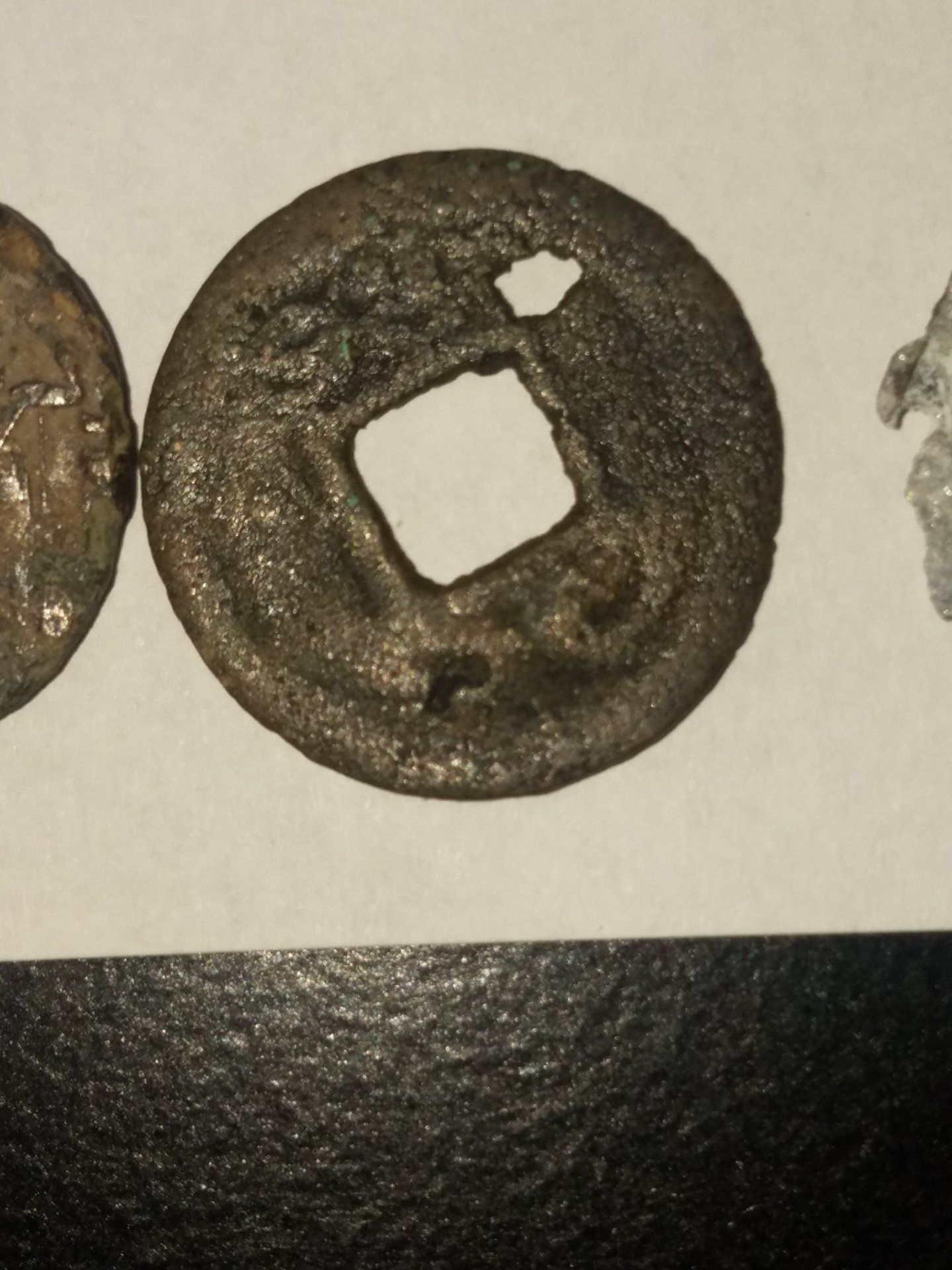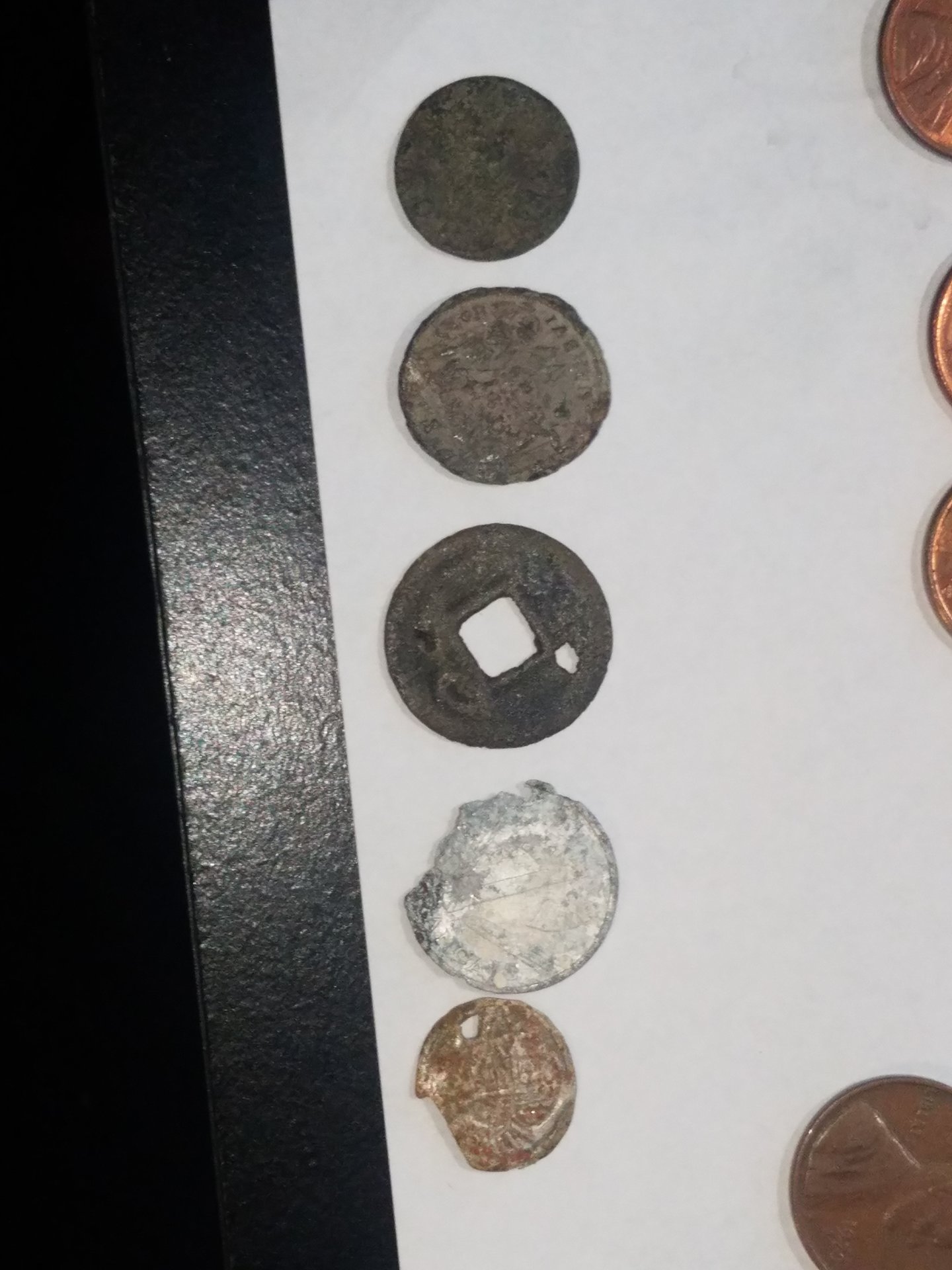 The coin in the 4th picture isn't ancient, its a copper solidi of John Casmir II of Poland (1648-1668), the coin with a hole in its center isn't ancient, its early modern, the coin is a Qing dynasty copper cash coin (1644-1911), the chipped coin is just modern foreign currency, and the coin in the slab could be ancient, but a cull, and unidentifiable.
