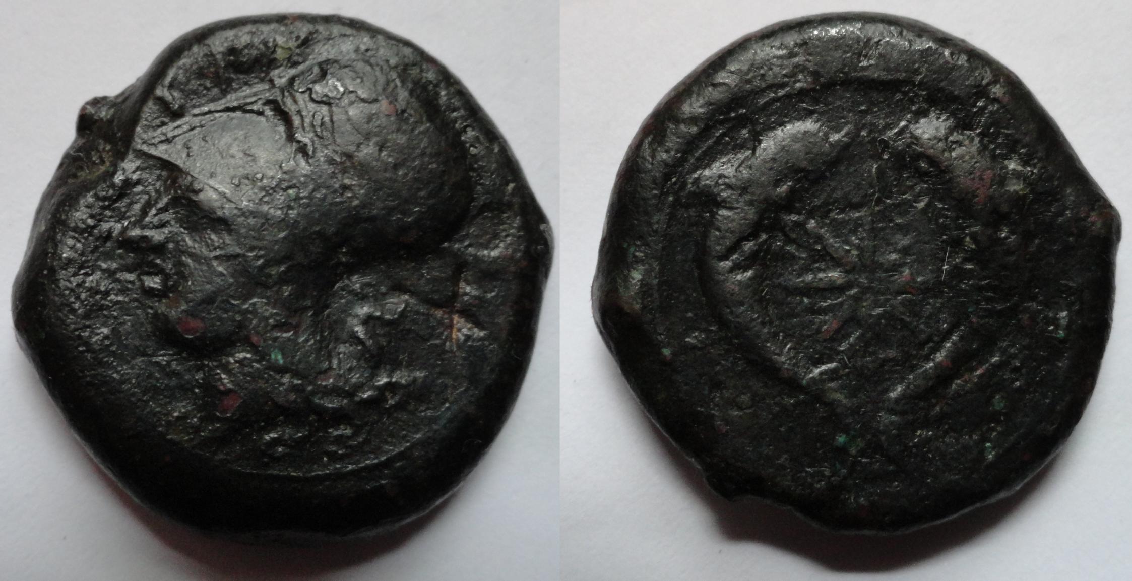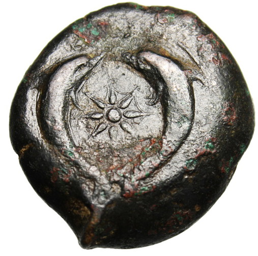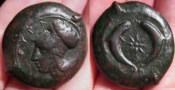 I have had my eye on this coin for over a year I have seen its price reduced many times. Many times I was committed to another coin or was broke or some other deal I felt I couldn't pass up came along. I have recommended it to several friends whom were looking for a similar type. For whatever reason it went unsold. I felt that this coin was meant for me to appreciate. A large gorgeous thickly patinized black ancient bronze litra from the time of the tyrant Dionysios I to the time of the Third Democracy.405 -367BC I handed the coin to my wife and asked her what she thought. (shes not into coins) She responded," It doesn't feel like a coin- it feels like a rock!" I think thats a good discription of what it feels like. I said "Yea A very smooth cold rock - Struck in Syracuse after 395 BC!!! Italy,Sicily,Syracuse AE Litra 25.16 g x 29.2 mm Time of Dionysios I - Third Democracy 405-367 BC. Struck after 395 BC. Obverse: Head of Athena left, wearing Corinthian helmet decorated with an olive wreath - SYPA Reverse: Octopus between two dolphins. ref: Calciati II pg. 128, 62/70; SNG ANS 454; SNG Morcom 697. Sear #1189