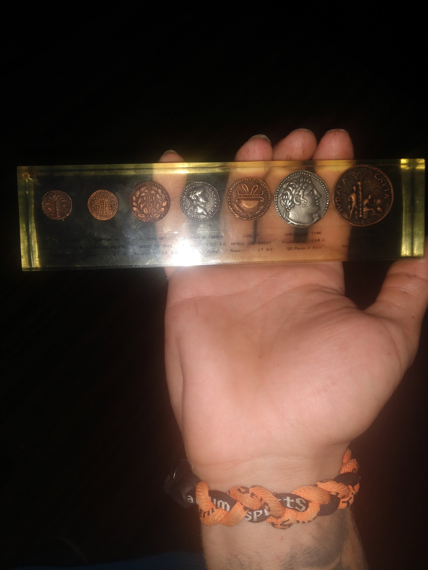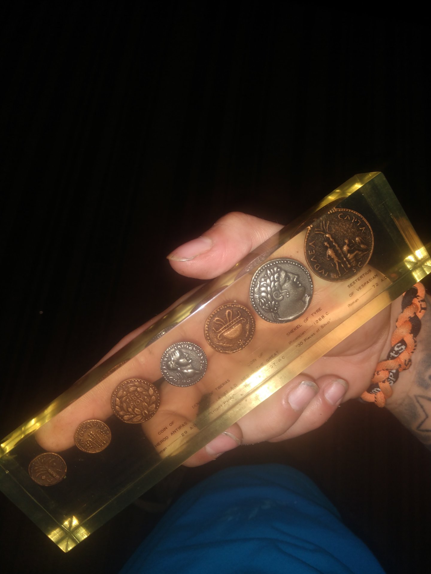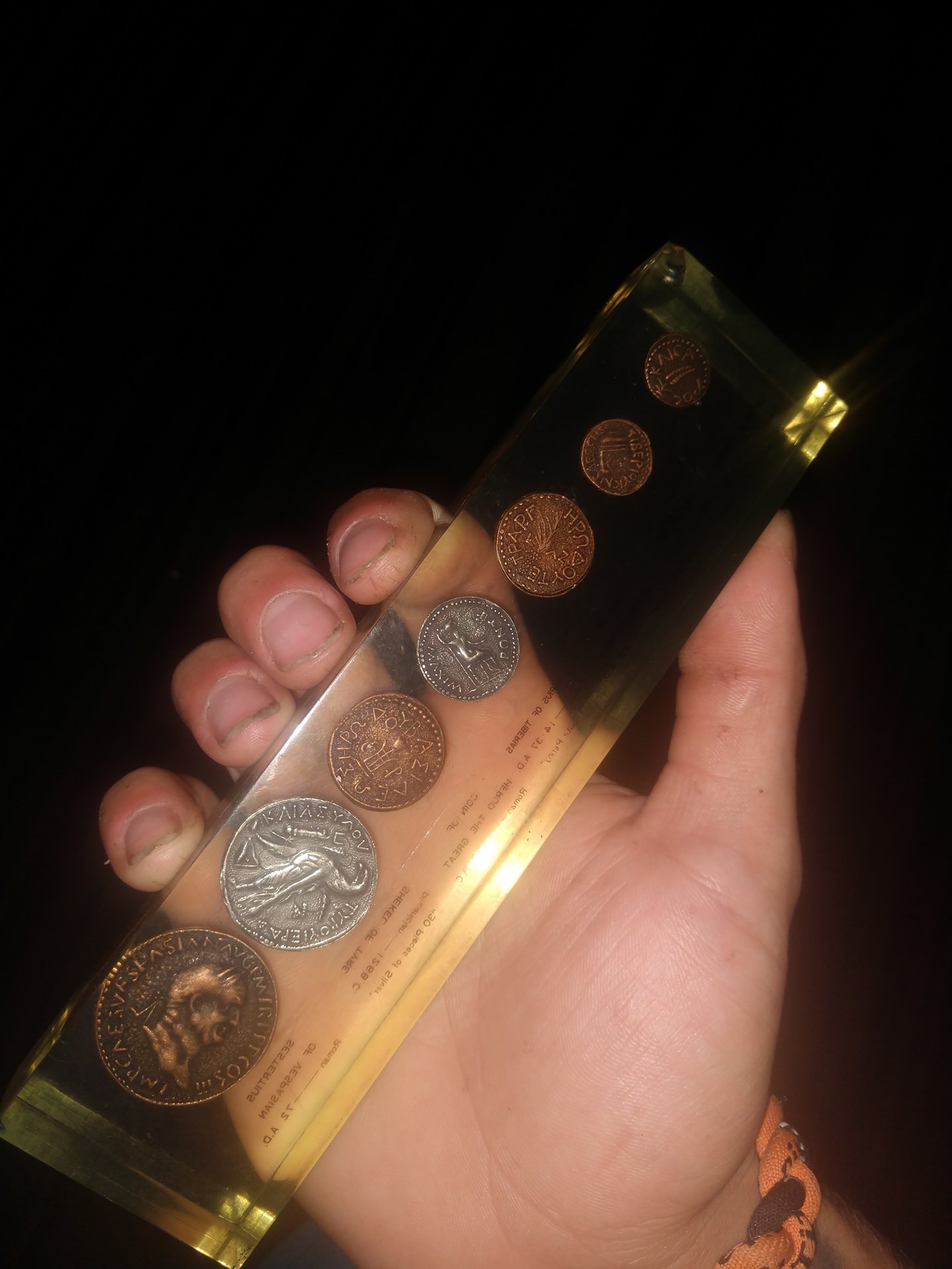 No. Not even remotely authentic. That being said, that's a nice Lucite (paperweight?) of some vintage (maybe 40-50 years old), so since they are older replica coins inside a vintage souvenir item, they might have some modest value anyway. $5-10 on the low end and $20-25 on the high end, I'd estimate. @H8_modern collects such things, and is likely not the only person who does.