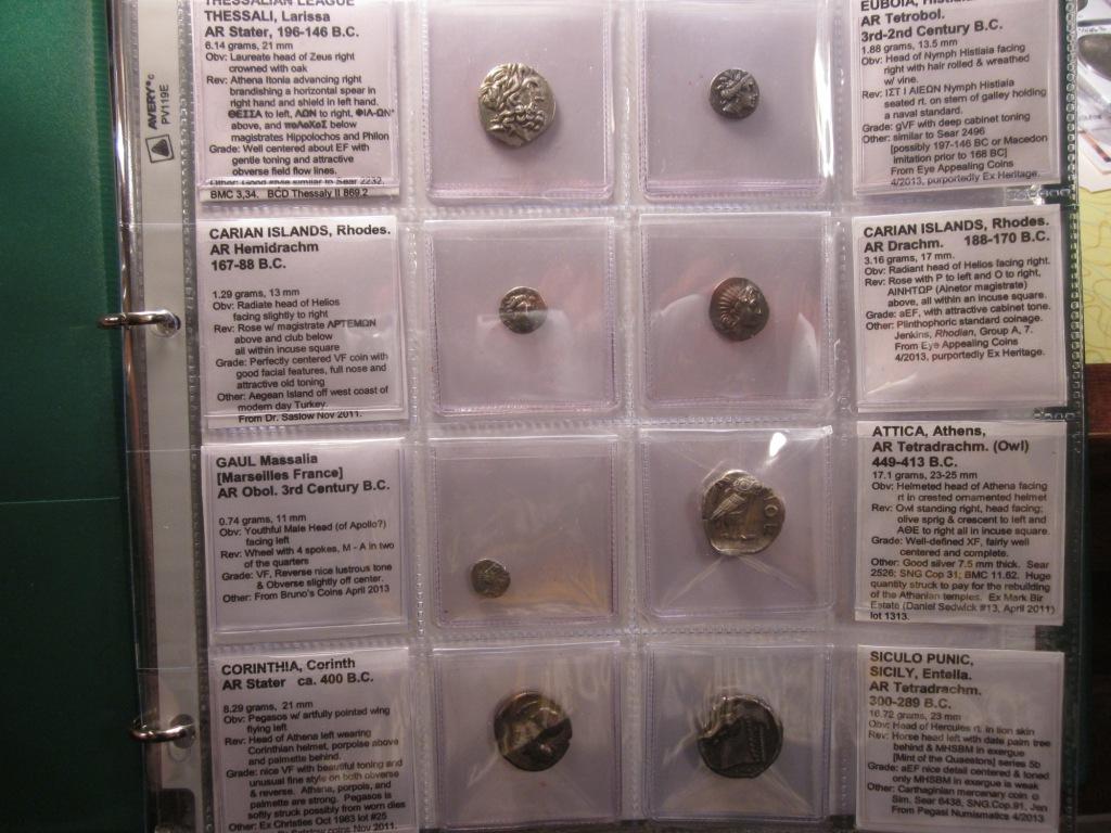 Wanna see collect89’s entire Greek coin collection? My Greek coin collection is small & ALL can be shared in this one post. (Don't blink or you might miss it). The total is currently a whopping eight coins. That number would only double if my monstrous Roman coin collection was added to the mixture. Here is the colossal collection depicted on one 3-ring binder page. This 3-ring 20-pocket page is archival quality. The page is transparent but it is not very flexible. I kind-of like having the coin displayed alone & the insert displayed separately. This configuration is working fine because of the small number of coins. #1 Each coin is in an archival quality flip. The observer can view both sides of each coin on the page by just turning the page. :thumb: #2 Each label is also in a flip. The reverse of each label includes printed contact data & a hand written code describing the date & price paid. When the label text is longer than 2" it just gets folded so that the balance of the text can be read from the other side. Also, the original paperwork that came with each coin can be stored in the label flip. :thumb: Of course, there is a down side to this system. The coins could easily be separated from their information and the coins can move around inside their flips. With such a small collection, these are not currently important issues. It would be nice to have many Greek coins so that it would become troublesome to use this adopted storage system. Maybe some day.... The individual coins and label descriptions follow. Feel free to click “like” on any that you truly like. :smile