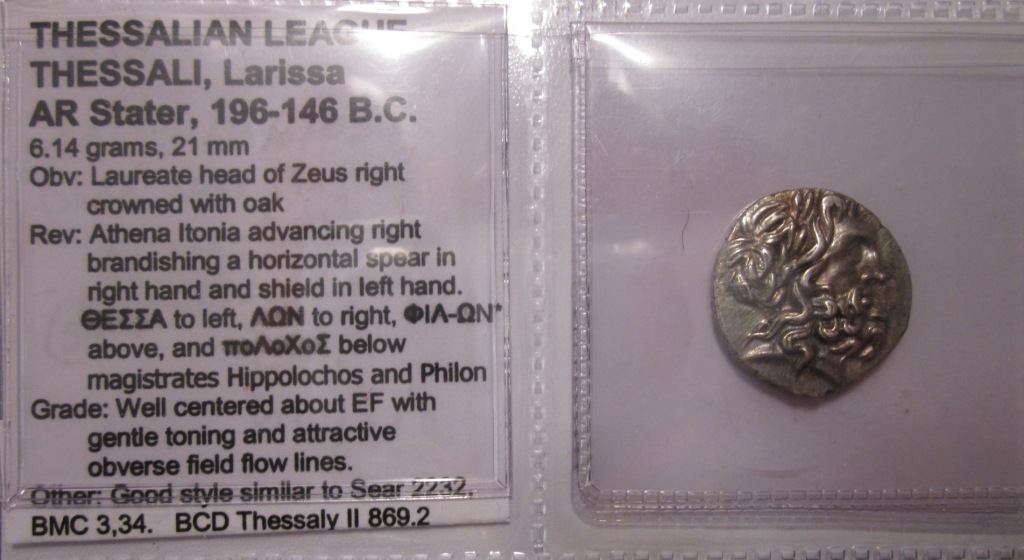 Starting at the top THESSALIAN LEAGUE THESSALI, Larissa AR Stater, 196-146 B.C. 6.14 grams, 21 mm Obv: Laureate head of Zeus right crowned with oak Rev: Athena Itonia advancing right brandishing a horizontal spear in right hand and shield in left hand. ΘΕΣΣΑ to left, ΛΩΝ to right, ΦIΛ-ΩN* above, and ποΛοΧοΣ below magistrates Hippolochos and Philon Grade: Well centered about EF with gentle toning and attractive obverse field flow lines. Other: Good style similar to Sear 2232, BMC 3,34. BCD Thessaly II 869.2 [Double Victoriatus = 1.5 Denarii]. Ex La Galerie Numismatique (Heritage Jan 2013) lot 61035 From Eye-Appealing Coins April 2013