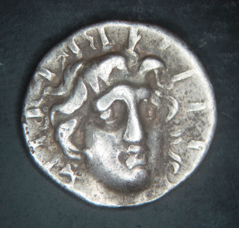 CARIAN ISLANDS, Rhodes. AR Hemidrachm 167-88 B.C. 1.29 grams, 13 mm Obv: Radiate head of Helios facing slightly to right. Rev: Rose w/ magistrate ΛΡΤΕΜΩΝ above, P and club to left, O to right, all within incuse square. Grade: Perfectly centered gF coin with fine facial features, full nose and attractive old toning. Other: Aegean Island off west coast of modern day Turkey. From Dr. Saslow Nov 2011.