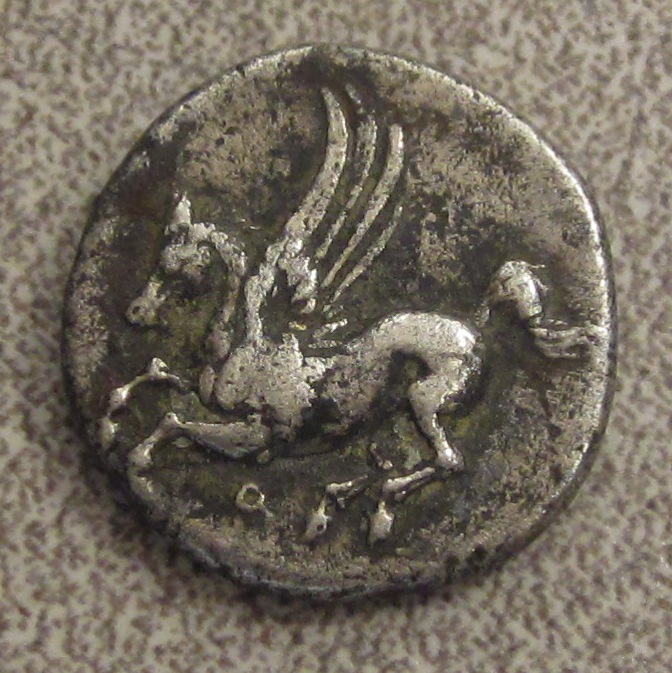 CORINTHIA, Corinth AR Drachm Late 4th Century B.C. 2.6 grams, 14.5 mm Obv: Pegasos flying left, koppa below Rev: Head of Aphrodite left, hair in a sakkos, Grade: gF toned Other: Older references identify the head as Nymph Peirene. Corinth mint. From Bedford Coins May 2013