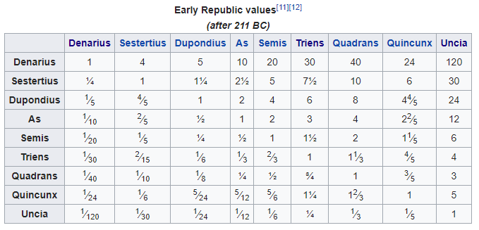 Hmmm... From MY perspective, and several other Roman Republic collectors, your link is ALL WRONG!!! (Actually, I tried to find the equivalent info on Forum, and they appeared not to have a similar write-up. Bummer) 10 Asses = a Denarius (not this deflated 16 to an As... ) https://en.wikipedia.org/wiki/Roman_currency And I just HAVE to toss in this incredibly FUNKY RR denomination: Quincunx = 5 Unicae, when there was 12 Uncae to an As... WHAT??? WHY??? I got this just because... I. JUST. HAD. TO. HAVE. ONE. RR Anon 210 BCE AE23 Quincunx 6.96g Apollo P behind Dioscuri Luceria 5 pellets Craw 99-4 Syd 309 Sear 910 Very Rare