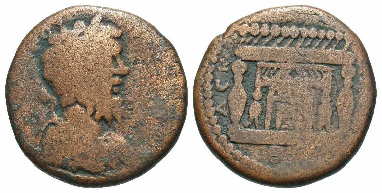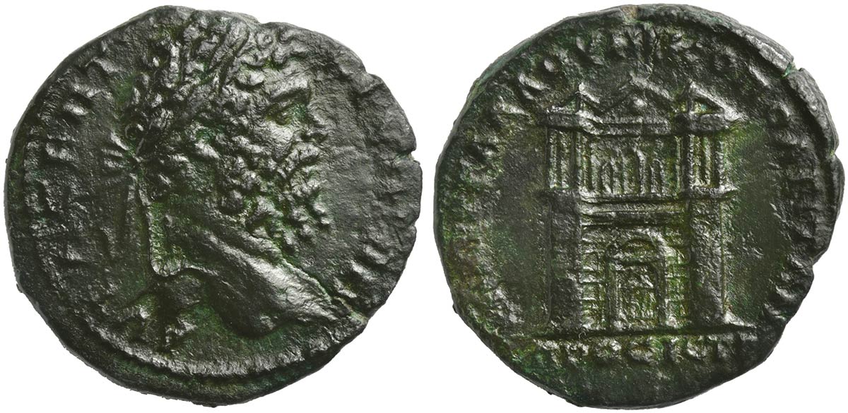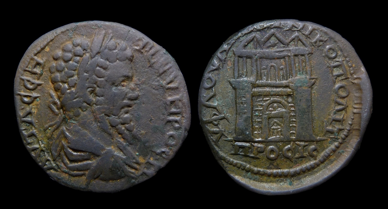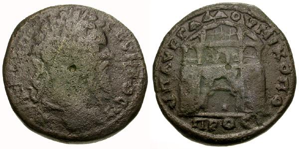 Here's a still recognizable Septimius Severus. From Ascalon, Judaea. Posssibly the temple of Phanebal. Building with four doorways, one within the other, the arcchitraves decorate with uraei; the columns of Egyptian style; in exergue, date (ΘT).