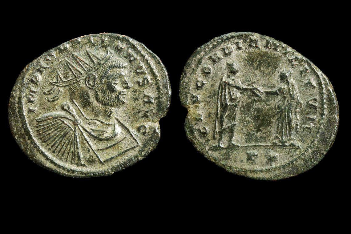 http://www.forumancientcoins.com/dougsmith/aurelian.html It has been a long time since I posted a page on Aurelian but my auction winnings included a coin I had been wanting. When we think of obverse varieties, we usually thing of Probus but Aurelian has a few oddities including this really broad shouldered portrait from Siscia (I believe). The reverse is a common Concordia Militum but the coin becomes special due to the obverse. I am unclear on the exact dating since most of the broad portraits seem to be quoted as issue 6 in 274 AD but the V* mintmark seems to be issue 7. I do not have a better reference book than RIC so am relying on online sources. I would appreciate opinions on the proper attribution of this Aurelian. The coin is oval 27x22mm with an edge split that may be why I was able to win it. These usually sell for a premium and this one is pretty high grade except for the flan irregularity.