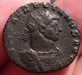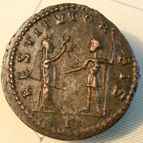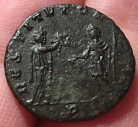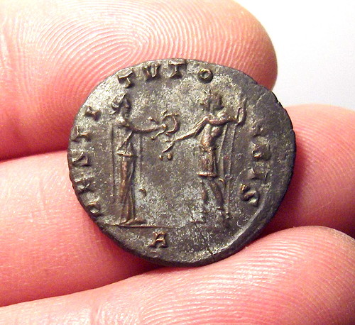 Looks like my version is taken just prior to Aurelian starting his "steroid routine" ... he must have looked into the mirror and decided that his shoulders needed to buff-out so that they'd match his abnormally long neck!!? Aurelian, AE Silvered Antoninianus Cyzicus Mint 272-274 AD Diameter: 22 mm Weight: 3.70 grams Obverse: IMP C AVRELIANVS AVG, radiate cuirassed bust right Reverse: RESTITVTOR ORBIS, woman standing right, presenting wreath to Aurelian standing opposite, A in exergue