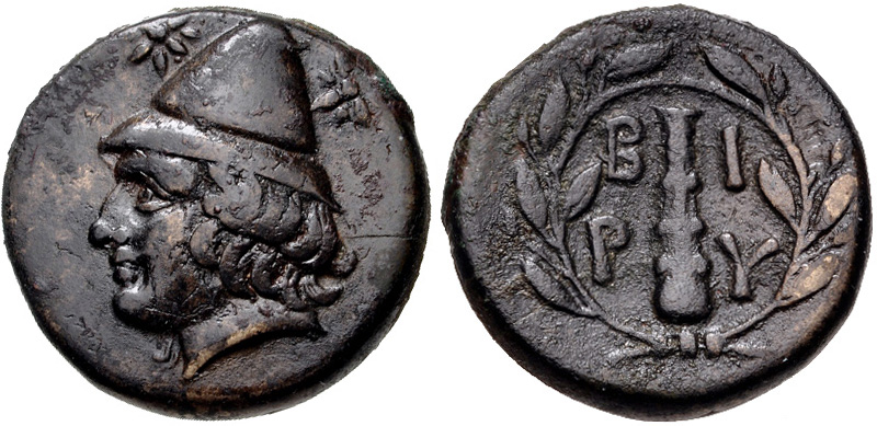 Kabeiros ... ummm, or Cabeiri? ... I've tried my best to research both references ... => here is my second coin purchase ...... this is actually my favourite of today's two purchases ... I "welcome" as much coin-info as possible ... TROAS, Birytis. Æ18 4th-3rd centuries BC Diameter: 18 mm Weight: 5.80 grams Obverse: Head of Kabeiros left, wearing pilos; two stars above Reverse: Club within wreath Reference: SNG München 168; SNG von Aulock 1502-3; SNG Copenhagen 247-8 Other: 1h … brown patina, minor roughness on reverse From the Demetrios Armounta Collection