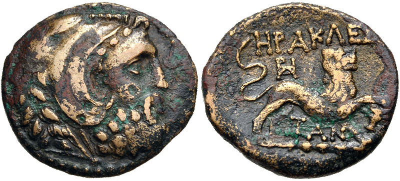Heracles... only one of them is on a coin, but the other is at least bronzed and still rather godly. BITHYNIA, Heraclea Pontica Circa 250 - 200 BC(?) Æ (3.35g, 18mm) Stancomb, Autonomous 7a, dies A2/– (unlisted rev. die); SNG BM Black Sea 1631; HGC 7, 489. O: Head of Heracles right, wearing lion skin. R: HRAKLEWTAN, Lion right; monogram above, facing boukranion between forelegs, club below. Ex Ronald J. Hansen Collection