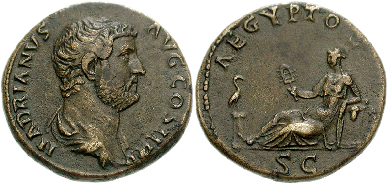 One of only a handful of my remaining Roman Imperial coins. Hadrian. AD 117-138. Æ Dupondius (25mm, 12.71 g, 12h). Struck AD 134-138. Bareheaded and draped bust right / Egypt reclining left, holding sistrum, resting elbow on basket; to left, ibis standing right on low cippus; S C in exergue. RIC II 839.