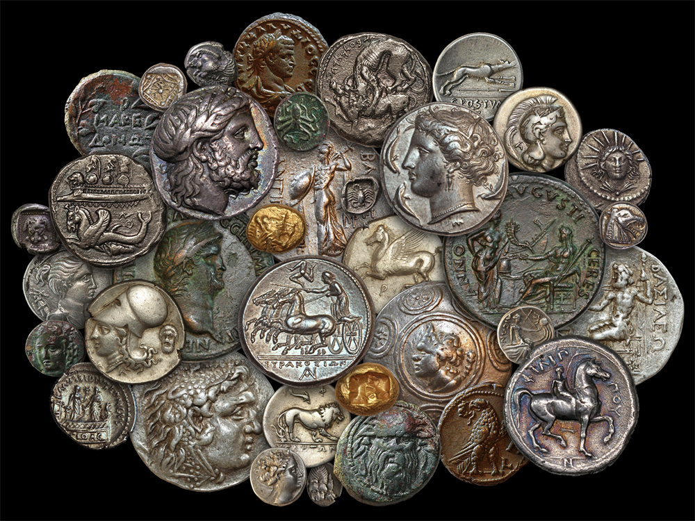 Here's a recent composite, basically aping AJ (again) but with relative sizes approximated. A few of my nicer coins are missing and a few shown here need photoshop touchups of the cut-out. The Corinth stater looks like it has black sharpie marker on the edges o_O