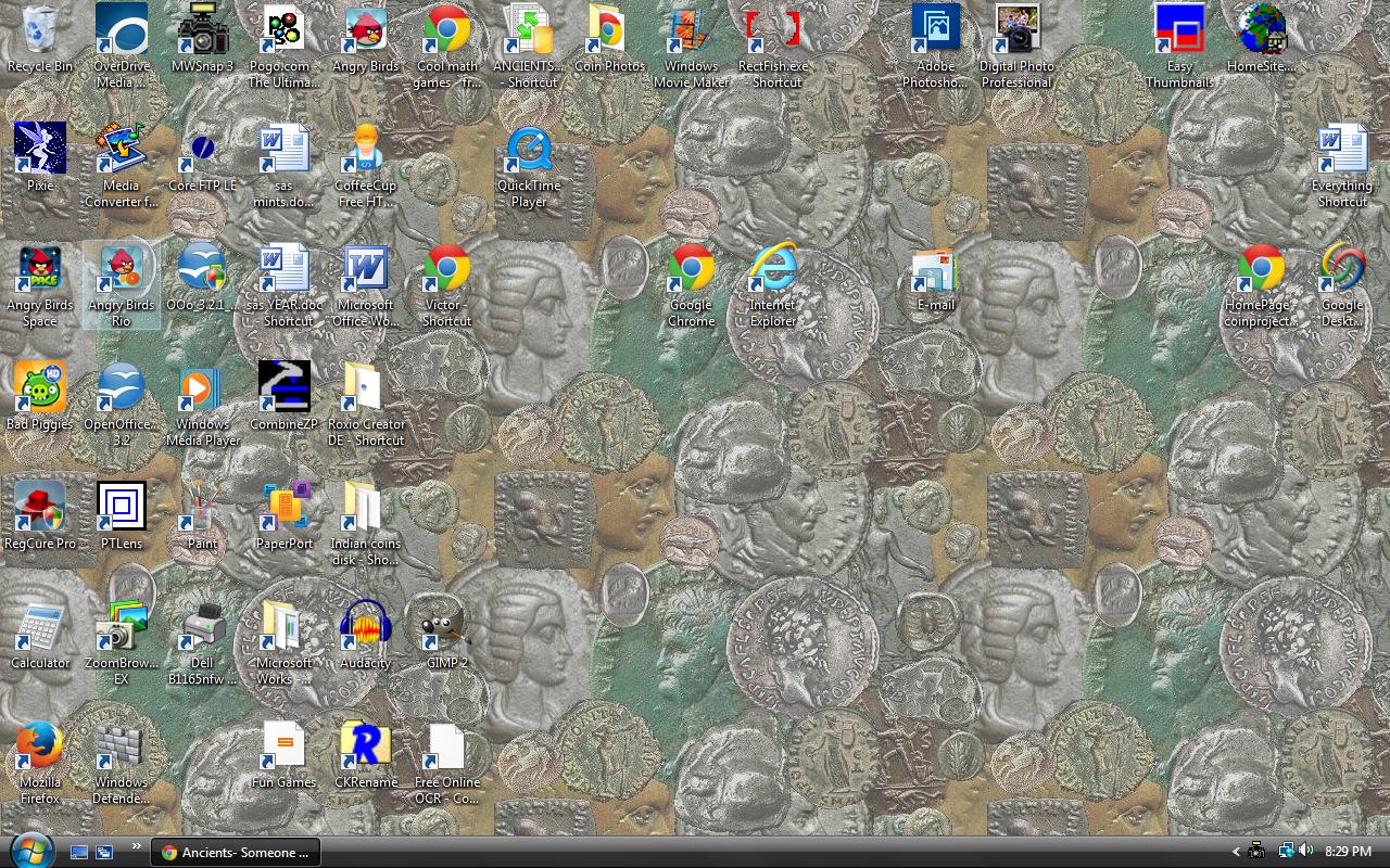 The next step after a pile like this is to trim and overlap the edges so you can specify it as a tile format desktop background (select the middle option where tiles are repeated). On my desktop, this tile repeats three times each way. I faded it out so the regular desktop icons would not get so lost in the jumble. The small image is what I use to make the desktop as shown in the screen capture.