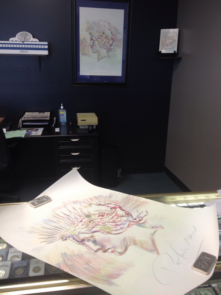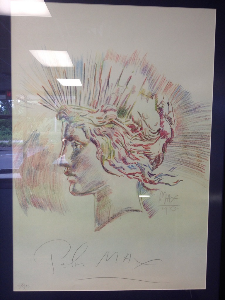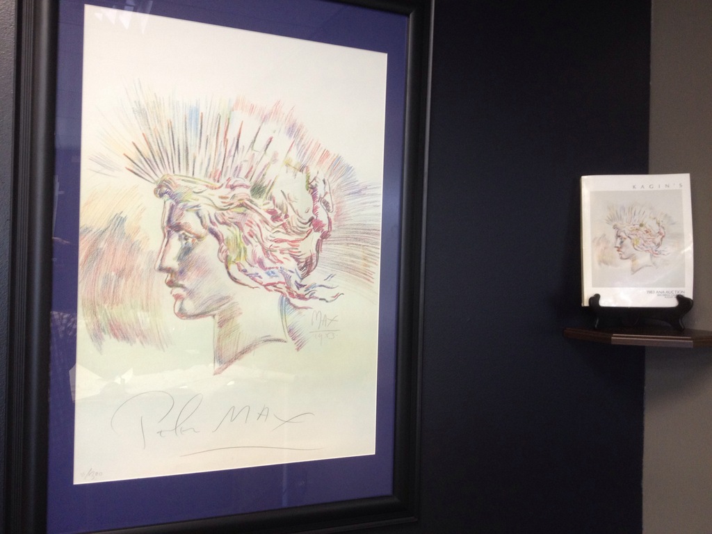 My second signed Peter Max Lithograph came in today. Not as nice as my 1st one but they are dang hard to find. My personal piece is #8 of the 300 produced for the Aug,16th 1983 ANA Kagin's auction catalog cover. I have this along with the auction catalog framed & hung in my shop. This piece that I just recieved is #145 of the 300. I purchased this one for a friend for his birthday along with a second catalog. A little conservation & this piece should frame up well behind glass.Didnt take a close up of the new one as it is still quite rolled and needs to be flattened ,ect... One of my favorite pieces of art & it looks mighty nice in the shop ! Oh & it is my avatar too (for now) Just wanted to share-