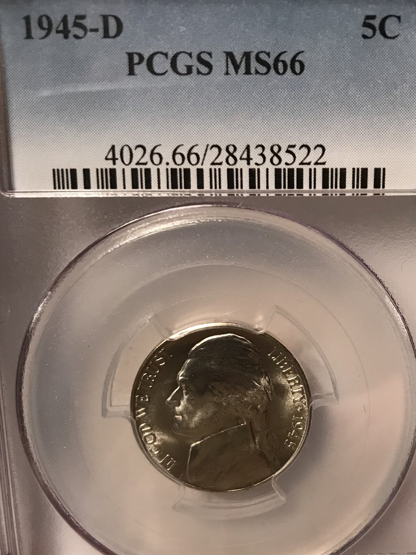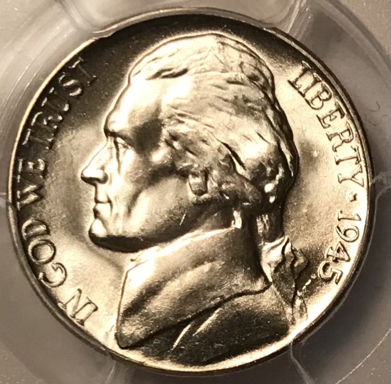 Another PCGS MS-66 Nickel. This is a 1945-D. Not quite a full step coin but close.