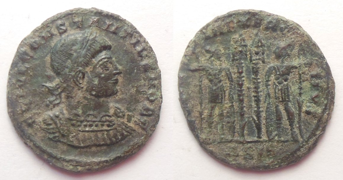 Constantius II, AE3 follis, Siscia mint, 330-348 AD, 1.9g, 17mm OBV: FL IVL CONSTANTIVS NOB C, Laureate, cuirassed bust right. REV: GLOR-IA EXERC-ITVS, two soldiers standing facing one another, holding spears and shields, two standards between with dot on banner. Mintmark ASIS. REF: RIC VII Siscia 221. This coin I believe could improve with some light cleaning and I think I'm going to do it soon, as soon as I get some distilled water. I'm out right now. Already posted some Constantius II history. IE... Lazy. lol